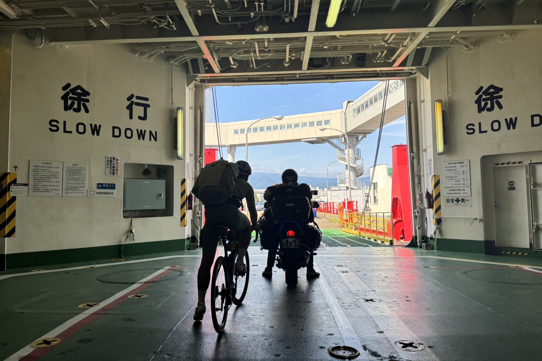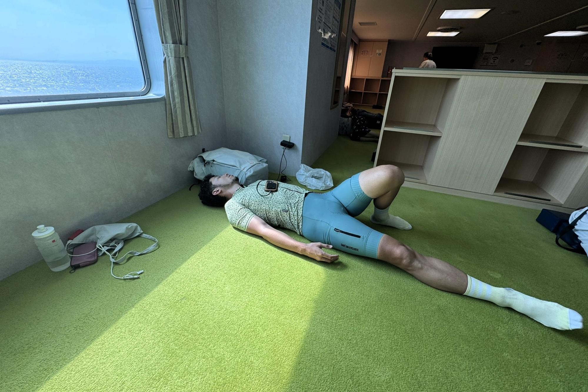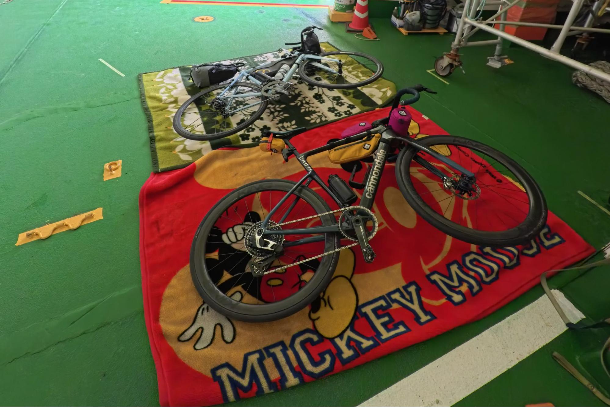 自転車はそのまま乗車した状態で船内へ。係員の案内に従い、指定された場所へ停めると、床には毛布が敷かれていてフレームをやさしく保護してくれます。しっかりと横たえられ、倒れる心配もなく安心して預けられるのが嬉しいポイント!