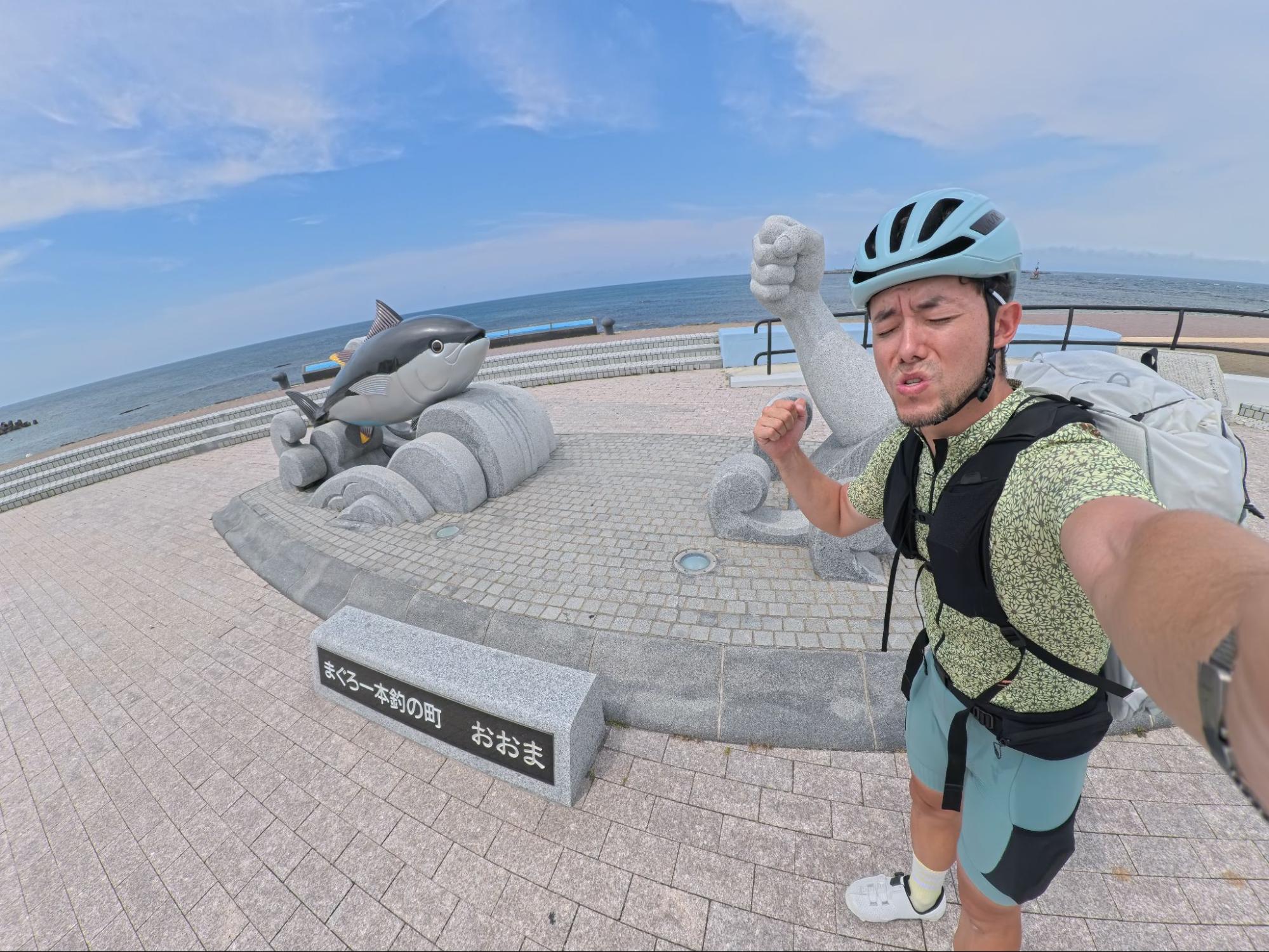 本州最北端の地「大間崎」。マグロ一本釣りのモニュメントを前に、思わず子どものようにはしゃいでしまった。