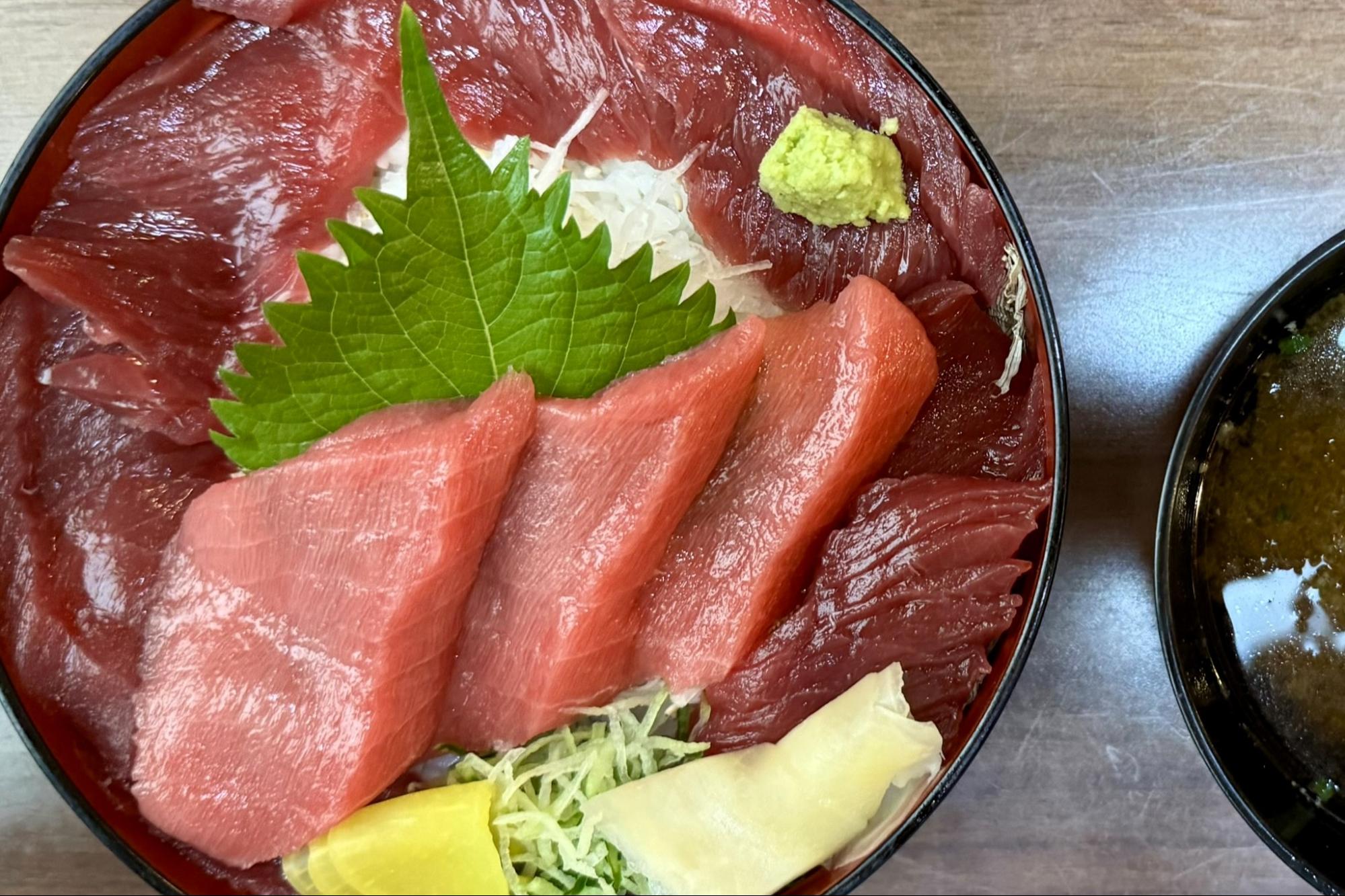 一生に一度は本場・大間で味わってみたかったマグロ。値段は張るけれど、やはりここは行っておくべき!ということで、本鮪・上丼(3,410円)を注文。艶やかな赤身と、とろける中トロが並び、ひと口目から至福。