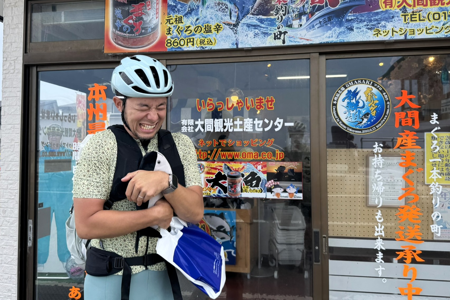 せっかくなので「大間観光土産センター」で家族へのお土産探し。本マグロはさすがにお財布と相談して断念したけれど、その代わりに選んだのはマグロのぬいぐるみ。思わずギュッと抱きしめてしまうかわいさ。このあとも自転車に乗るけど「どうやって持ち帰ろう?」なんてことは、買ったあとに考えることにしました。