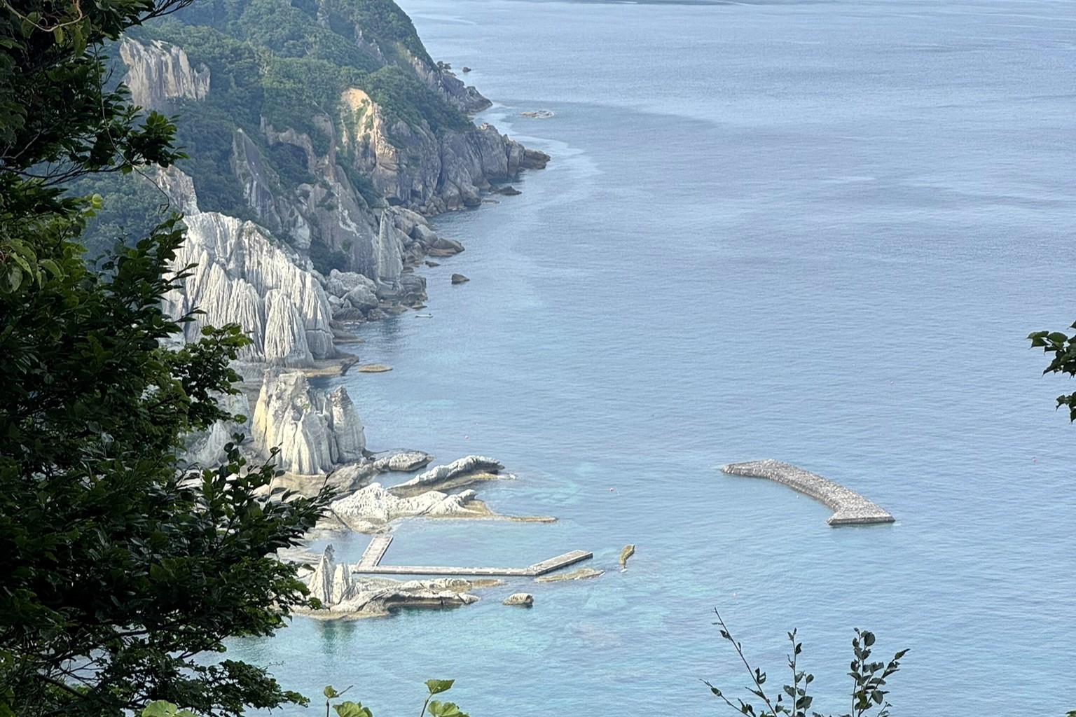 峠を越えると、視界が一気に開け「仏ヶ浦展望台」に到着。眼下には、荒波が削り出した白い断崖とエメラルド色の海が広がり、まるで自然が創り上げた彫刻庭園のよう。