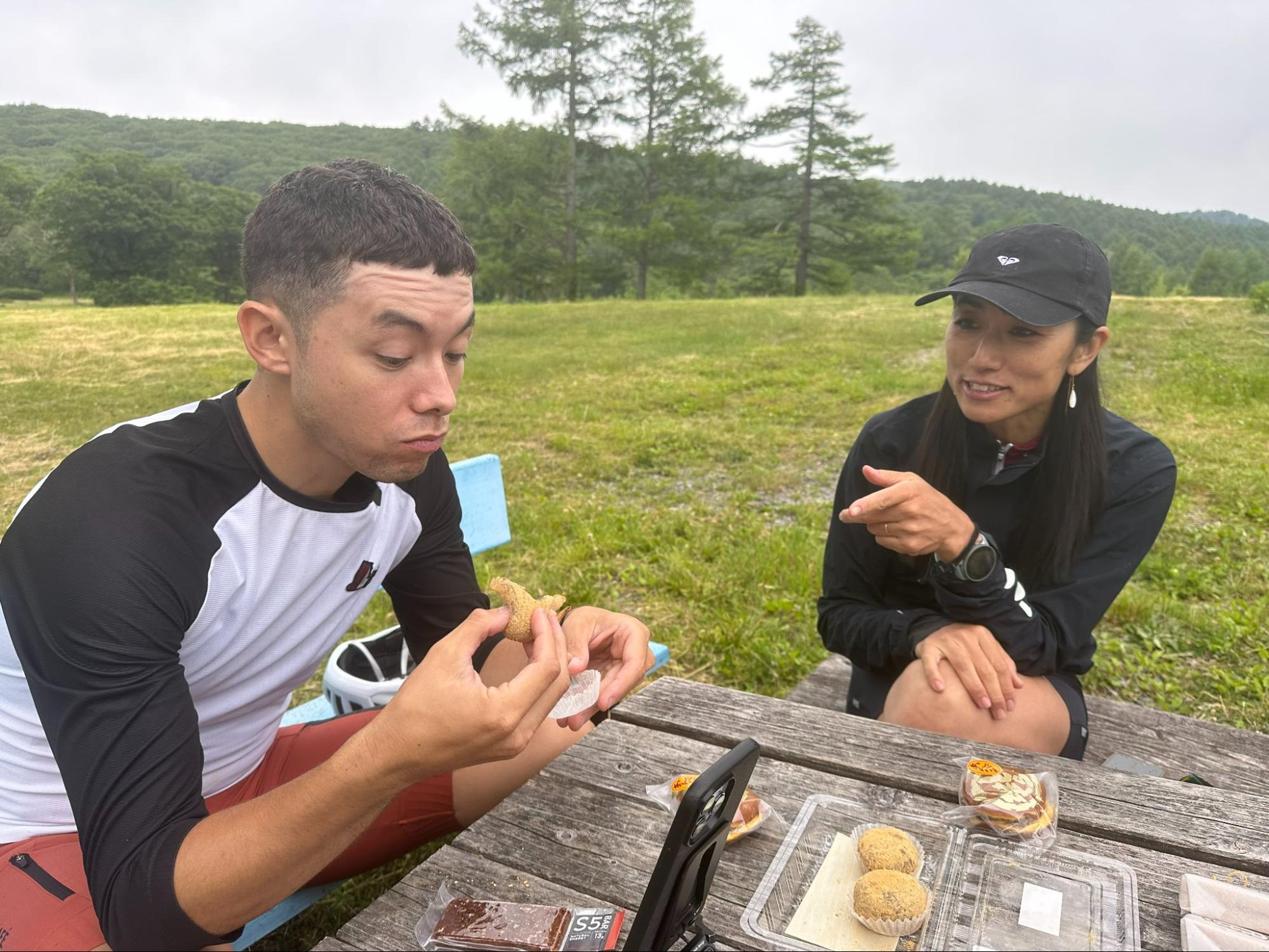 After driving about 20km, we arrived at Kaya-no-daira Kogen Campsite. Located on the north side of Shiga Kogen, this campground is rich in nature, with a virgin forest of beech trees. Incidentally, although there are toilets, there are no stores or vending machines, so please be careful when using them. Here, we were served Japanese sweets from the famous local store "Daikokuya," a gift from Manami-san. All of them were delicious, but the seasonal "Warabimochi" was the best. Unlike ordinary warabimochi, the fresh mochi is filled with anko (red bean paste).