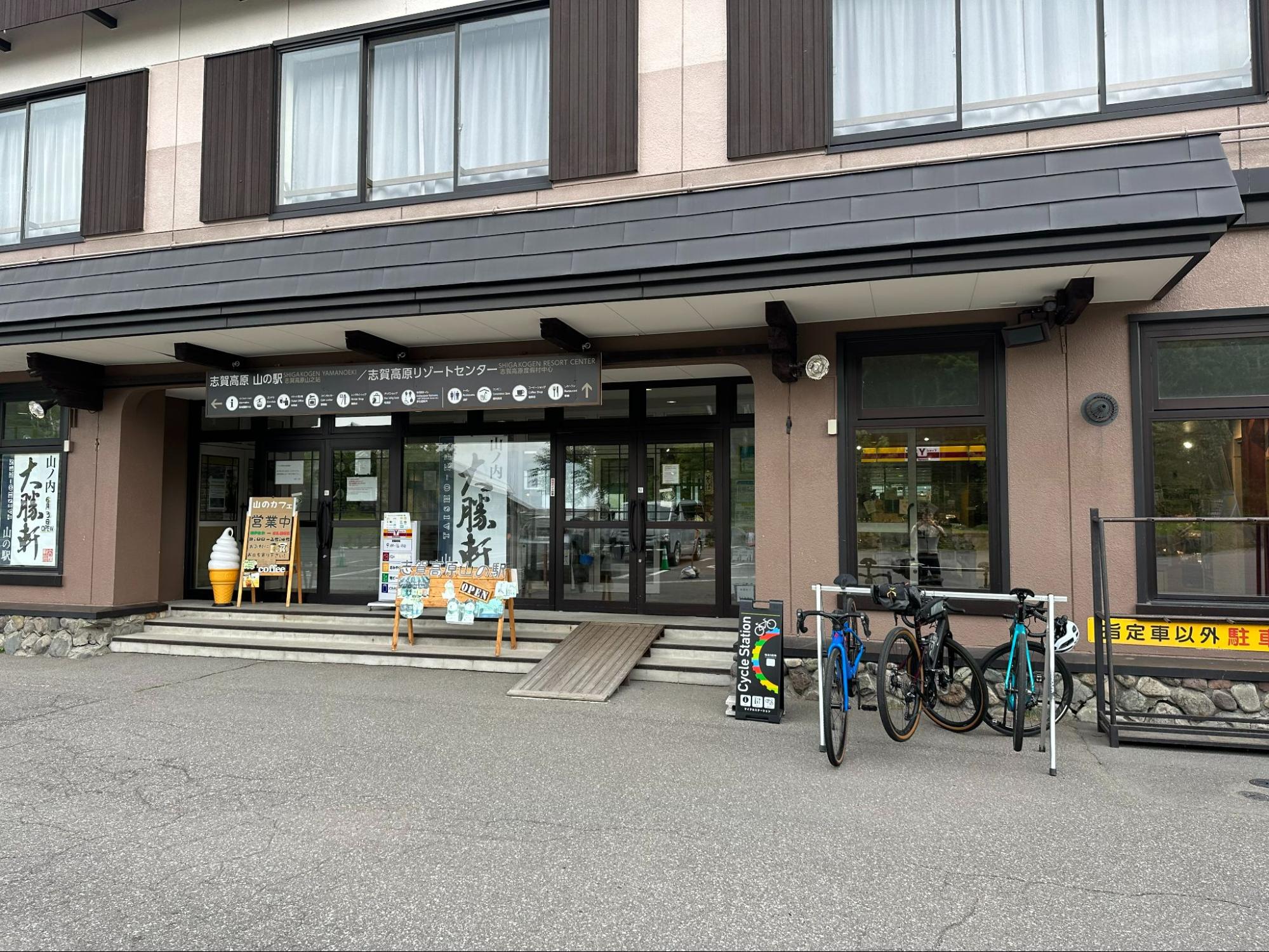 Traveling by support car, we arrived at Shiga Kogen Yama-no-Eki Mountain Station, where the lunch spot "Yamanouchi Taishoken" is located. Inside the facility, there are restrooms, cafés, and stores, so you can spend some time relaxing.