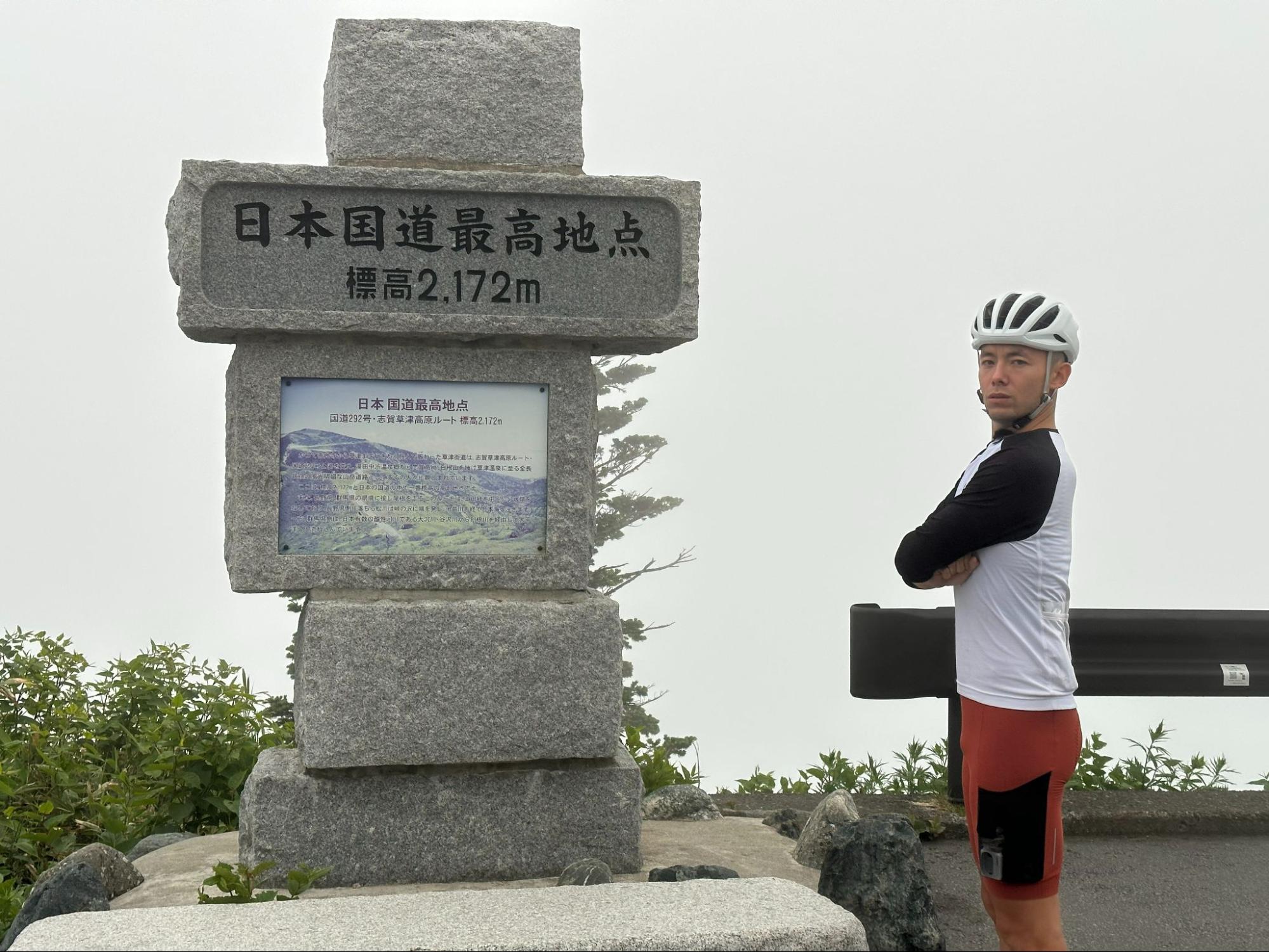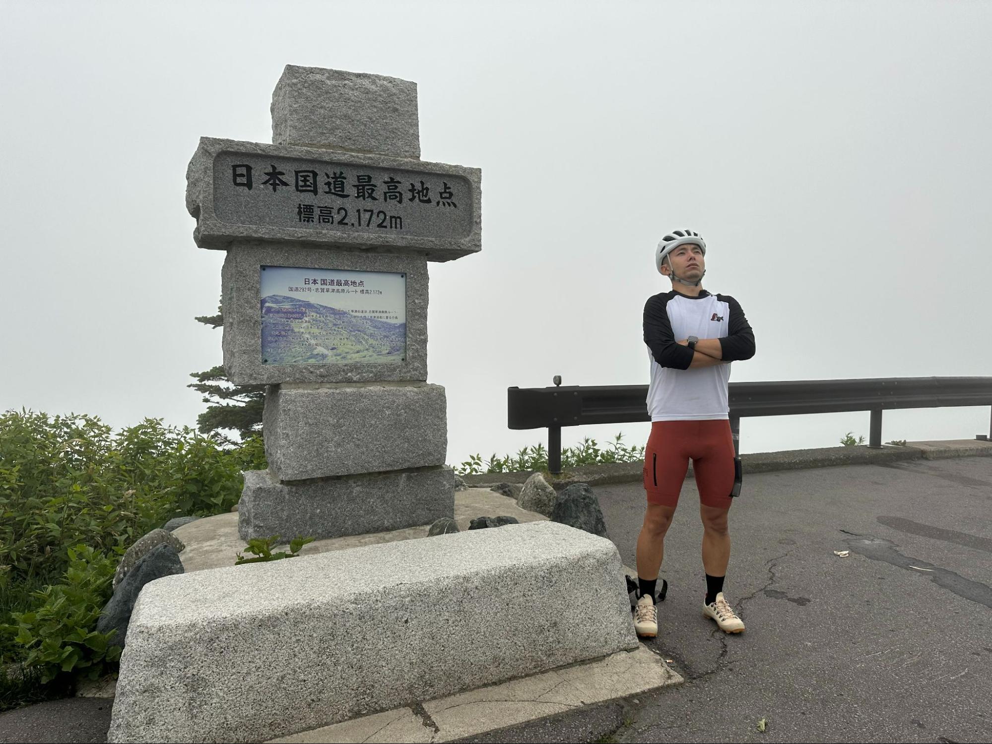 A support vehicle took us to Shibu Toge, located on the border between Gunma and Nagano prefectures. It is the highest point on a national highway in Japan. If the weather was clear, we would have a panoramic view of the Yoshigadaira wetlands below us, but unfortunately there was no visibility today. We witnessed the changeable weather at high altitude.