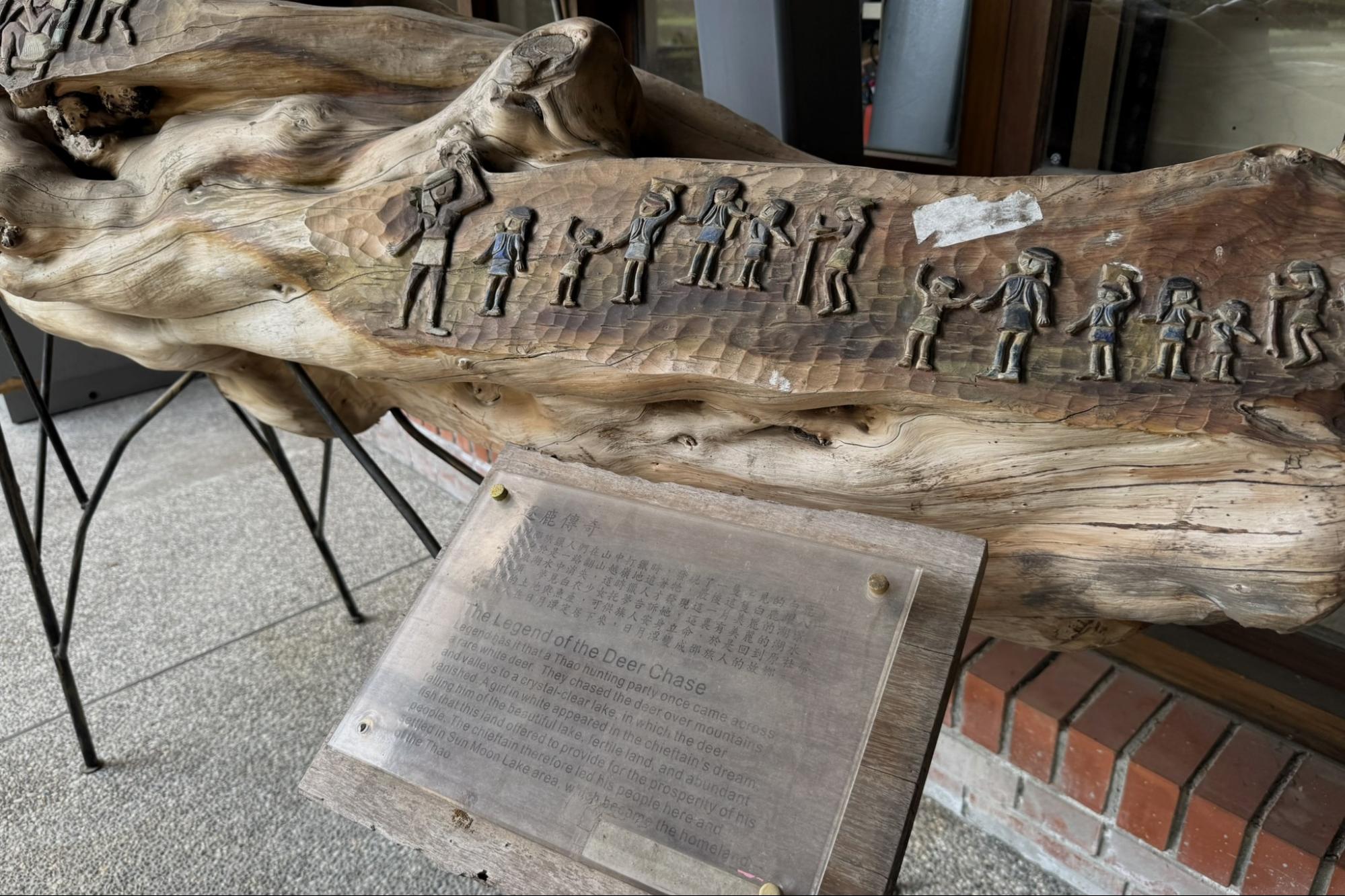 In a corner of the exhibition hall, we found a wooden carving depicting a Shao tribal legend. According to the story, hunters followed a deer across the mountains and discovered the sacred waters of Sun Moon Lake, eventually settling there. Even today, the lake holds deep spiritual significance for the Shao people.