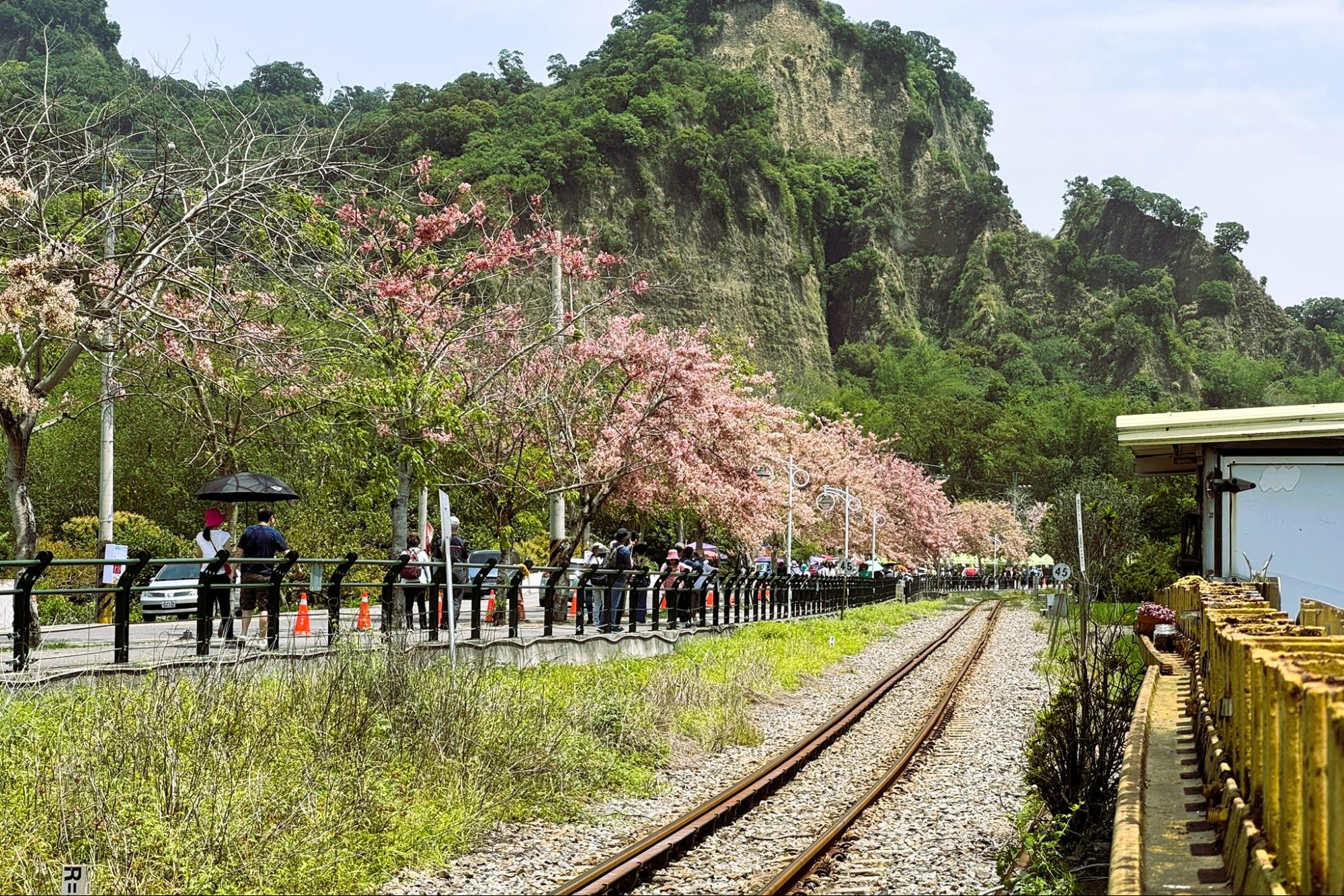 We arrived at the Ershui Flowering Goldenrain Tree section of the Jiji Line. These pale pink blossoms—often mistaken for cherry blossoms—are actually Taiwan Goldenrain Trees (Cassia fistula). The area was packed with photographers and tourists hoping to capture that perfect shot with the train. It was a breathtaking spring scene that stopped us in our tracks.