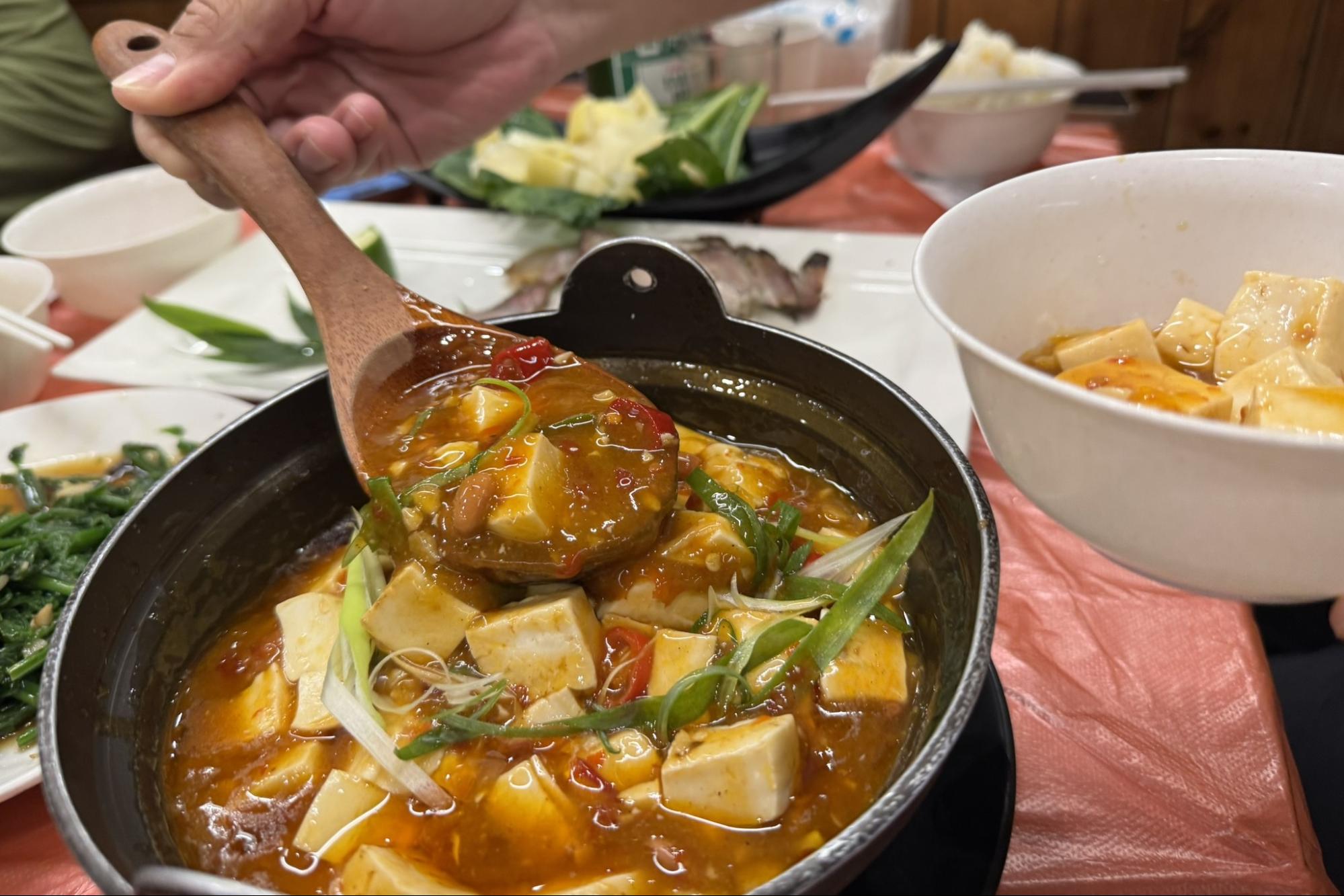 Alongside a few traditional local dishes, we also ordered Kenta’s all-time favorite—mapo tofu. The thick, savory sauce clung to the tofu perfectly. It was mild, flavorful, and deeply comforting—just what we needed after a long ride.