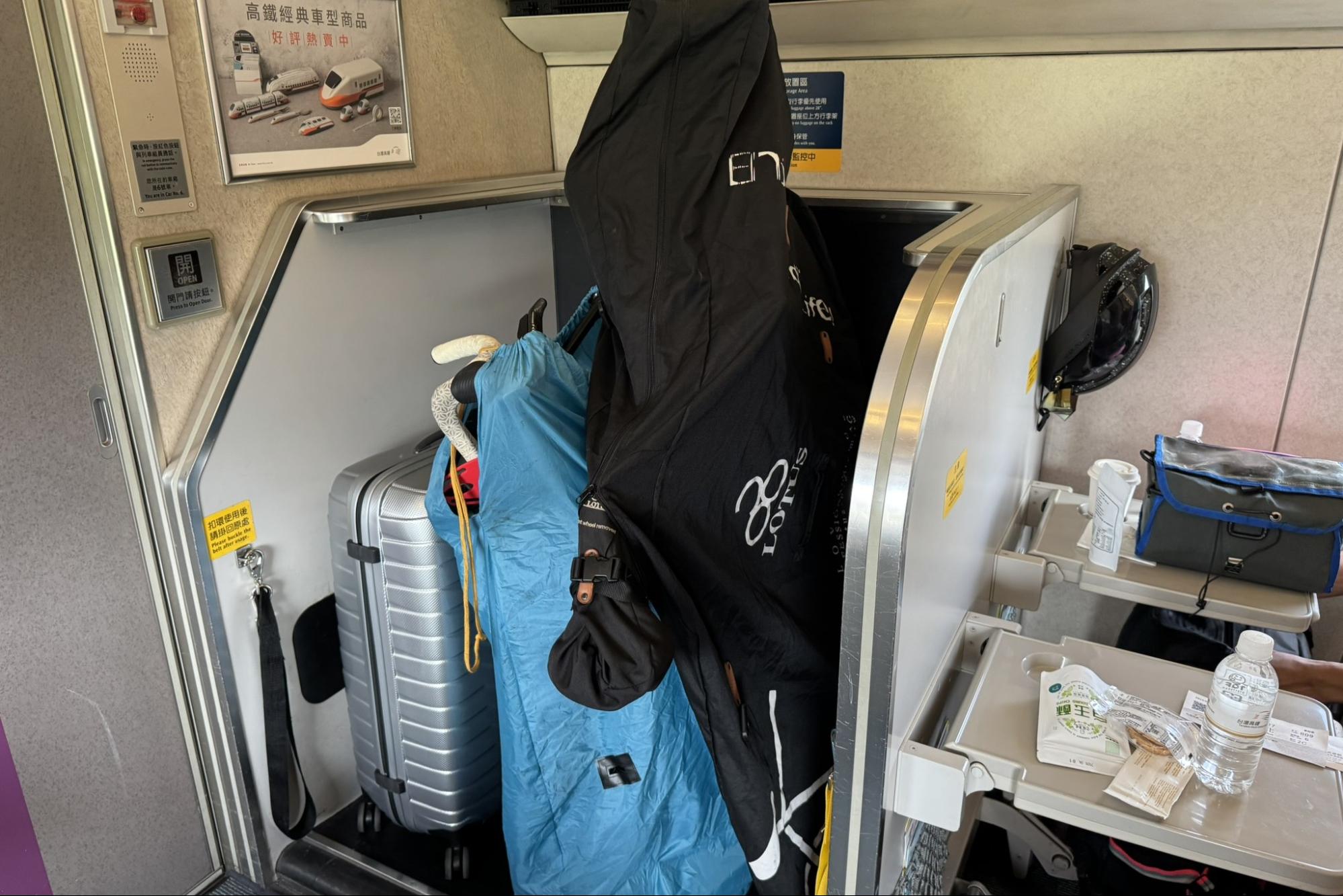 There’s a dedicated luggage space in the Green Car where bike bags can be stored. However, since space is limited, bikes need to be split up when traveling in groups. It’s also important to stand them upright to avoid blocking the aisle—small considerations that make a big difference.