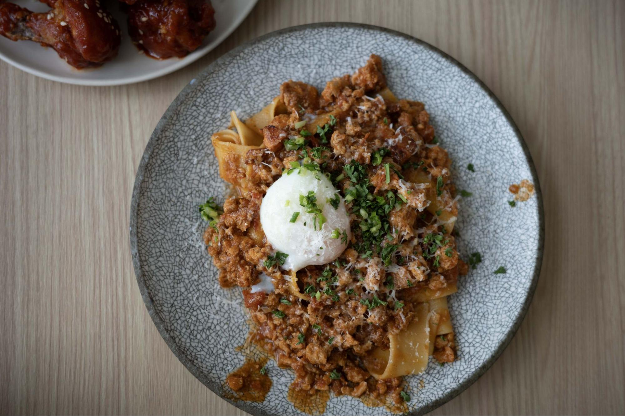 The thick noodles were cooked al dente and coated with a rich meat sauce.When we broke the soft-boiled egg and mixed it in, it added a gentle richness that was comforting.It was a deeply satisfying lunch plate.