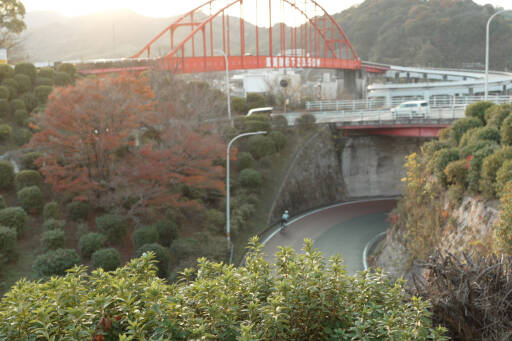 呉市と倉橋島を結ぶ 音戸大橋(おんどおおはし)。音戸の瀬戸に架かる赤いアーチ橋で、音戸側は日本初の2層半螺旋型高架橋。くるくると高度を上げて海を渡る、走って楽しい名物橋だ。