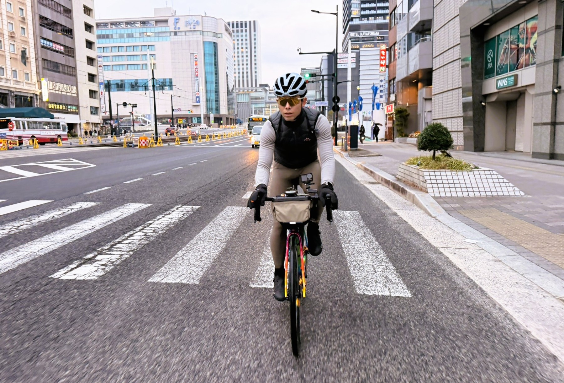 準備を整えてライドスタート。江田島へ渡るフェリーに乗るため、広島港まで約6kmを市内ライド。平日の朝とあって駅周辺は車の交通量がやや多く、周囲に気を配りながら港を目指す。