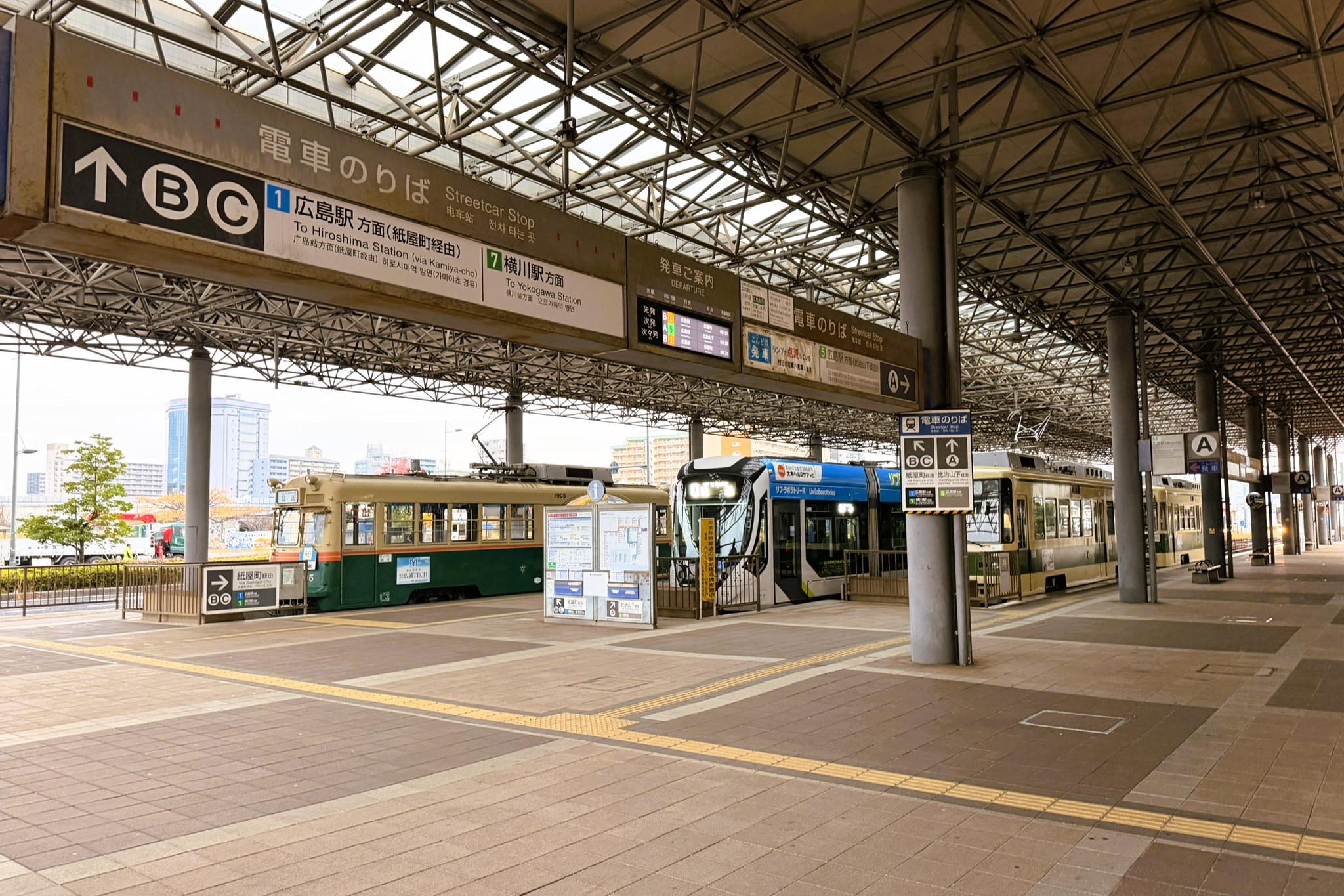 走ること約30分で広島港に到着。ここは路面電車の終着駅(広島港駅)でもあり、さまざまな車両が停車している。気づけば自転車そっちのけで電車を眺めてしまう。