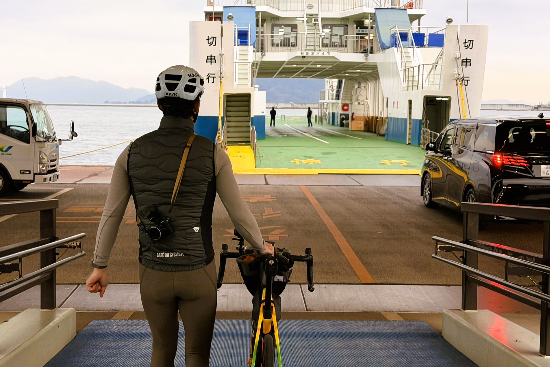 そうこうしていると、切串行きのフェリーが到着。順番に案内され、自転車と一緒にそのまま乗船する。この瞬間は、何度経験してもやっぱりワクワクする。