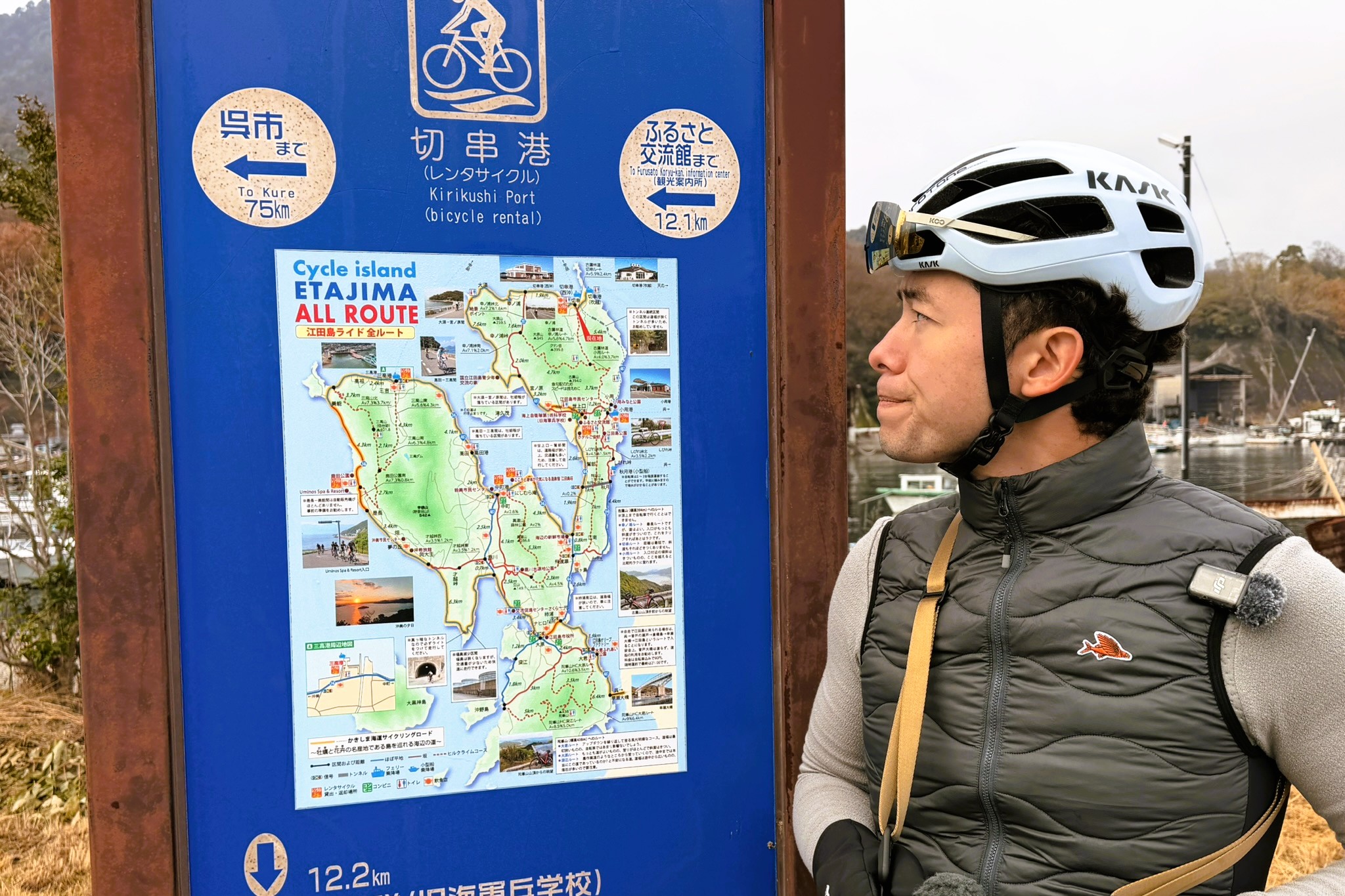 船はほとんど揺れることもなく、予定通り切串港に到着。無事に江田島へ上陸。今回走る「かきしま海道サイクリングロード」は、切串から呉までを結ぶ約70kmのサイクリングロード。