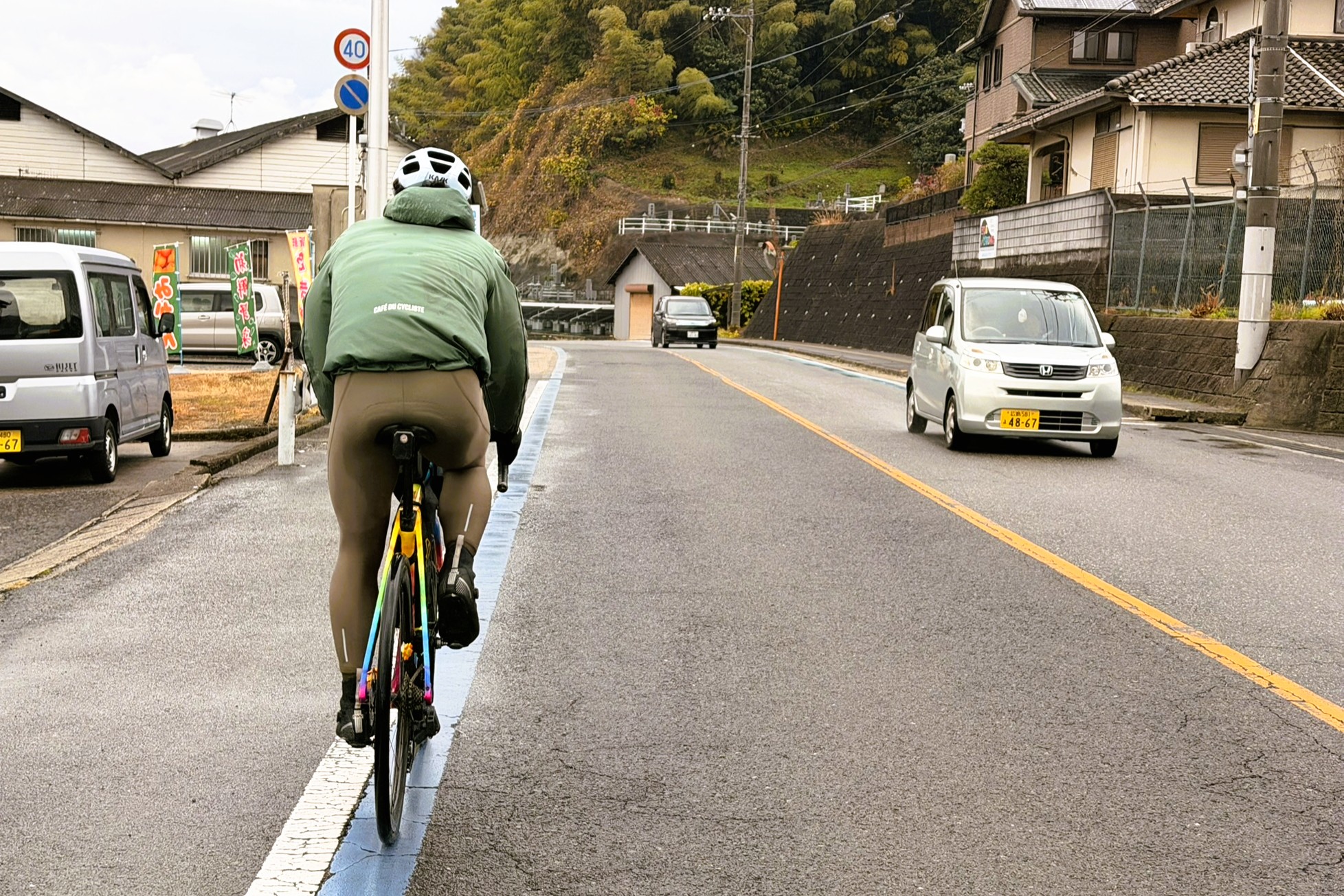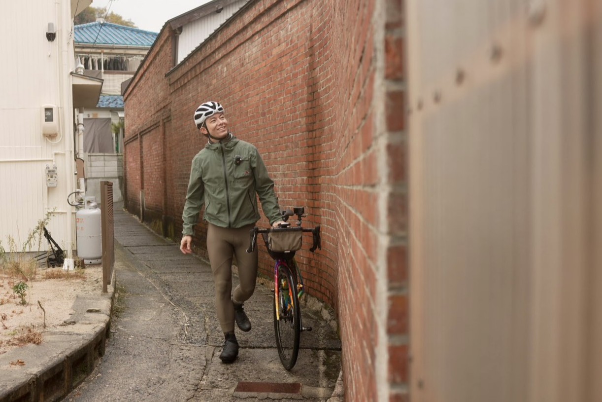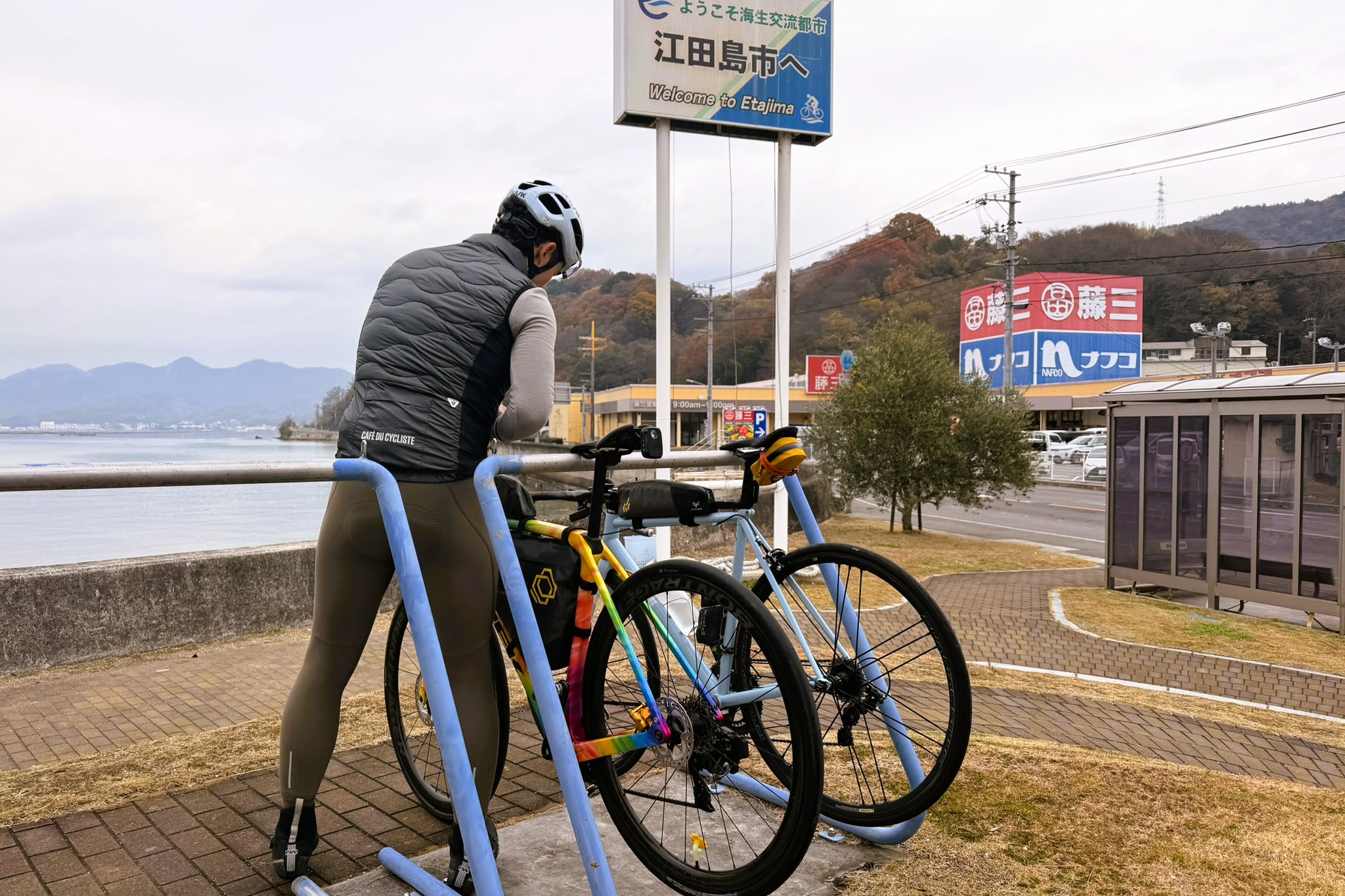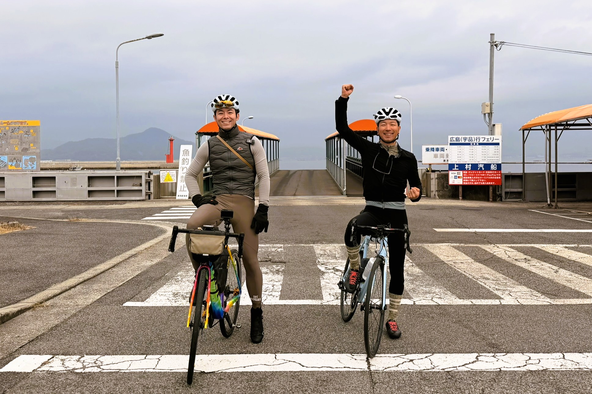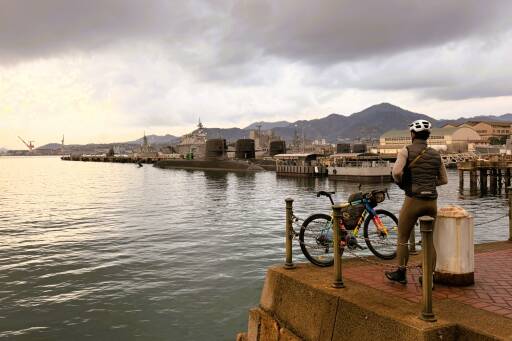 予報通り、昼過ぎから小雨の中を走っていると、前方から一人のサイクリストが。すれ違いざまに声をかけてくれたその方、なんと前日のけんたさんのSNSで江田島ライドを知り、夜勤明けのまま広島市内から江田島へ渡り、ぐるぐる走って遭遇を狙っていたという。無事に会えて本当によかった。こんな出会いがあるのも、旅と自転車の醍醐味だ。