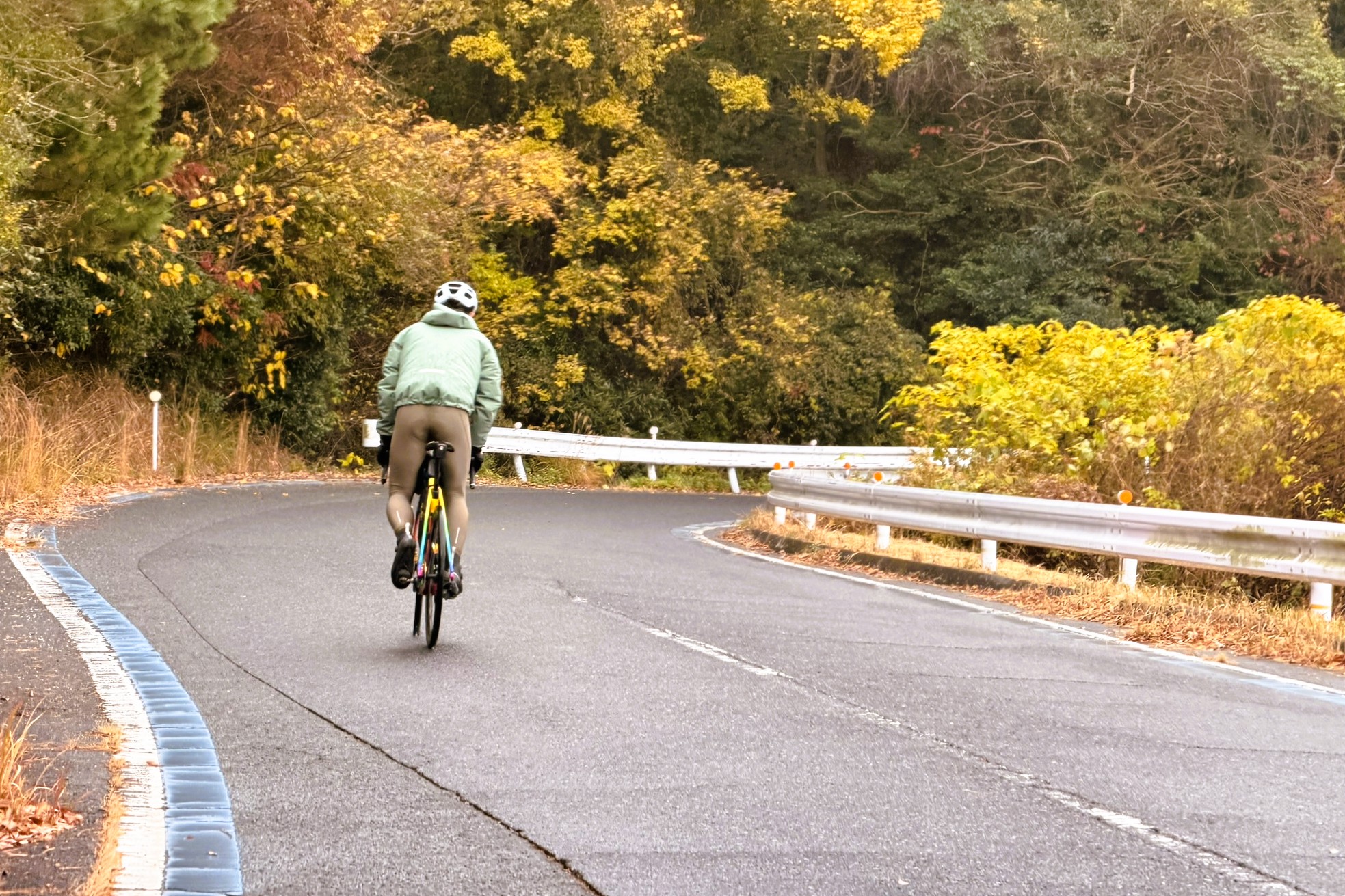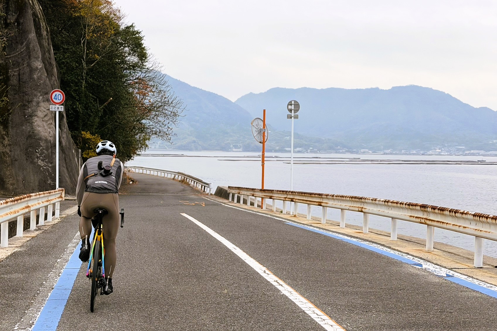 江田島は海沿いを走るだけのイメージだったが、実際にはちゃんと登りも用意されている。とはいえ斜度も距離もきつすぎず、ほどよいアクセント程度。平坦だけでは物足りないサイクリストにも嬉しい、飽きのこないルートだ。