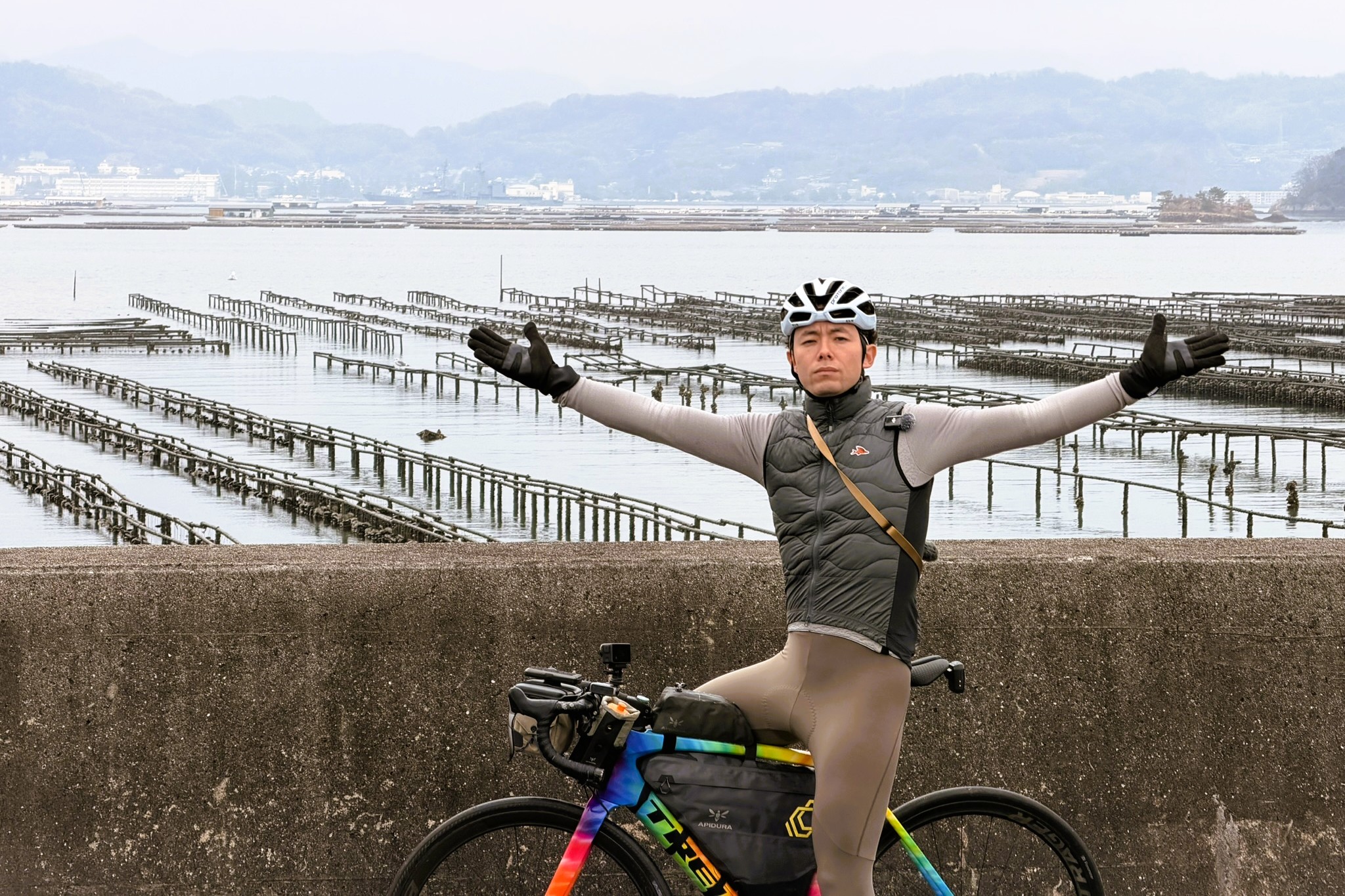 お腹を満たしてライドを再開。ルート沿いの海に目をやると、さきほどランチでいただいた牡蠣が養殖されている様子が広がっている。