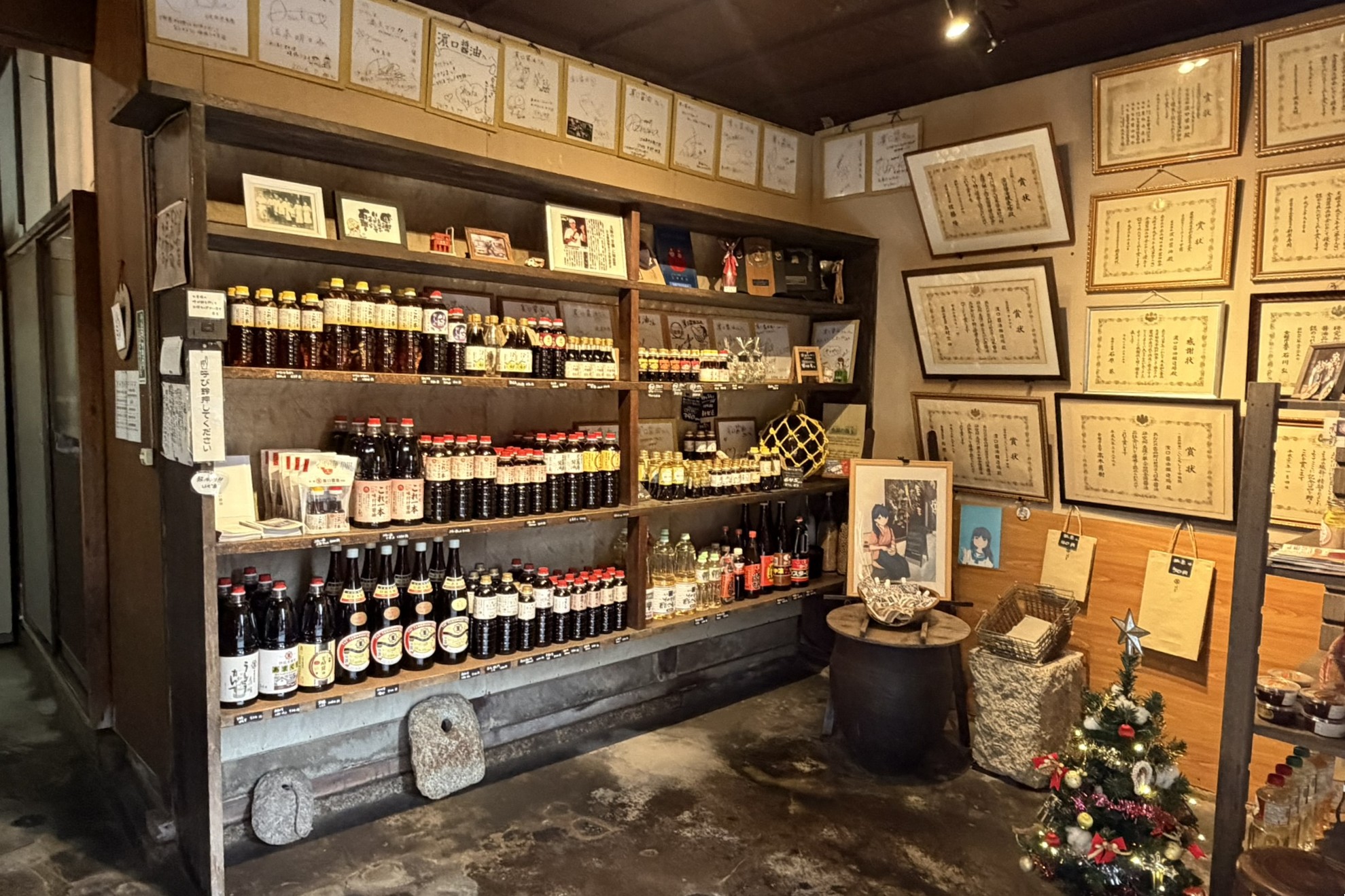 濵口醬油店は創業170年を誇る老舗。店内に一歩足を踏み入れると、ふわっと甘い醤油の香りに包まれる。壁一面には受賞歴を示す表彰状や有名人のサインがずらり。