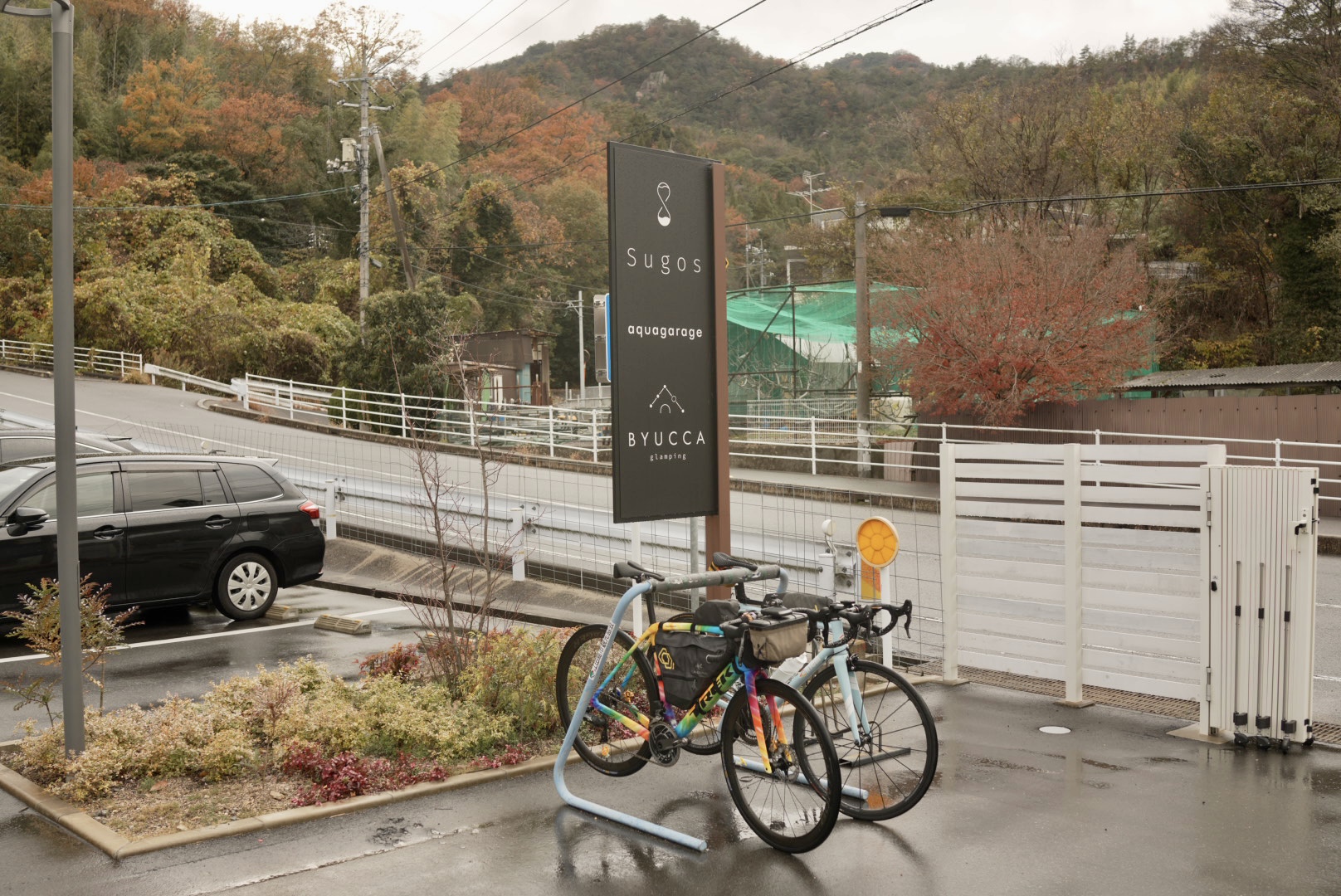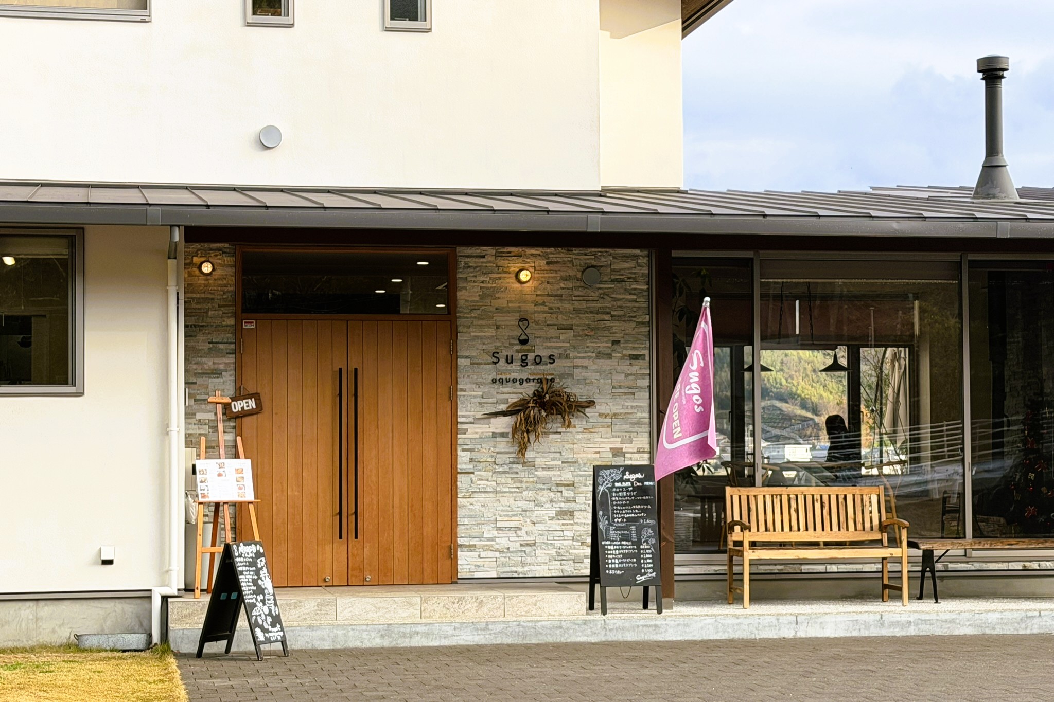到着したのは「Sugos cafe」。江田島市と呉市を結ぶ早瀬大橋のたもとにあるカフェだ。ここにもきちんとバイクラックが設置されていて、サイクリスト的には思わず気持ちが緩むポイント。「わかってるなあ」と、うれしくなる一軒。