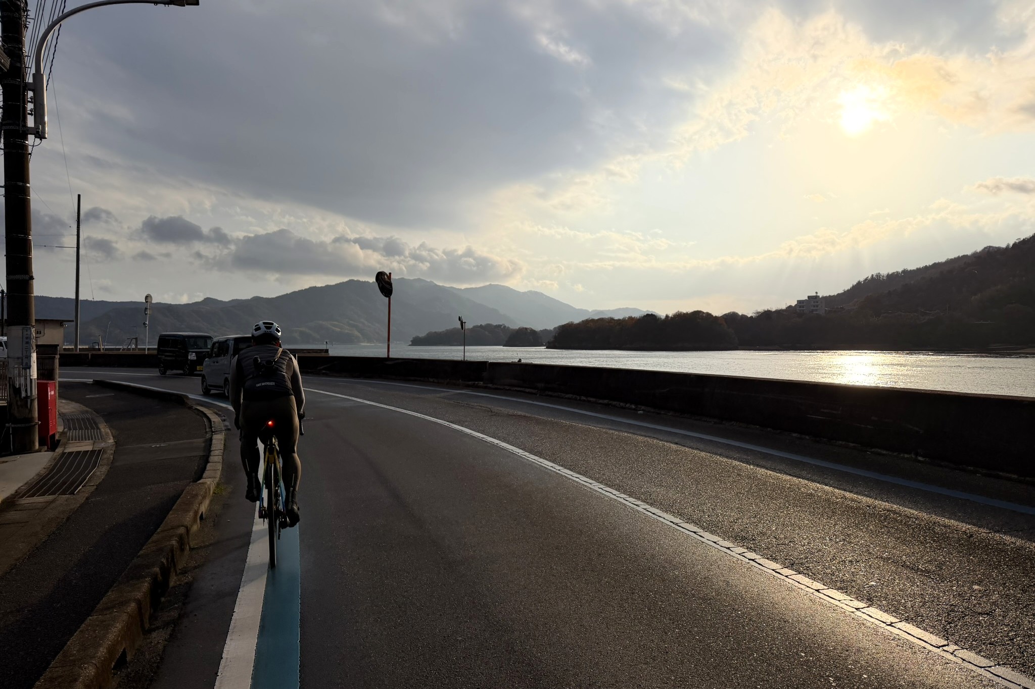 穏やかな瀬戸内海に、少しずつ夕陽が沈んでいくのを横目に走る。本当に静かで、時間がゆっくり流れているような感覚だ。海と山が折り重なる瀬戸内らしい立体的な景色は、眺めていてまったく飽きない。