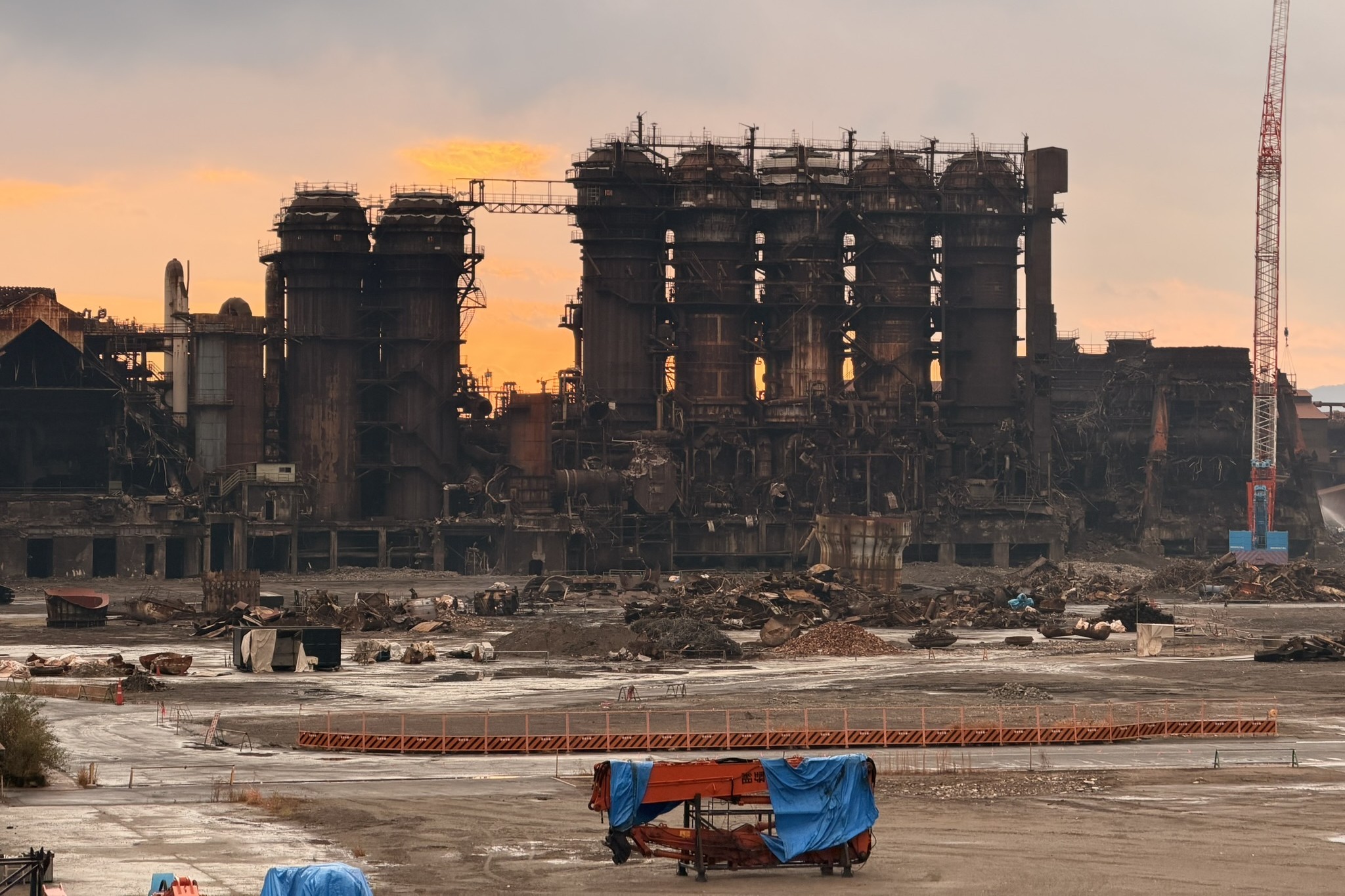 呉市内に近づくにつれて、周囲の景色は少しずつ工業地帯の表情へと変わっていく。写真に写っているのは、日本製鉄(株)瀬戸内製鉄所呉地区の解体現場。広大な敷地に佇む巨大な建造物は、遠目からでもそのスケール感がはっきりと伝わってくる。