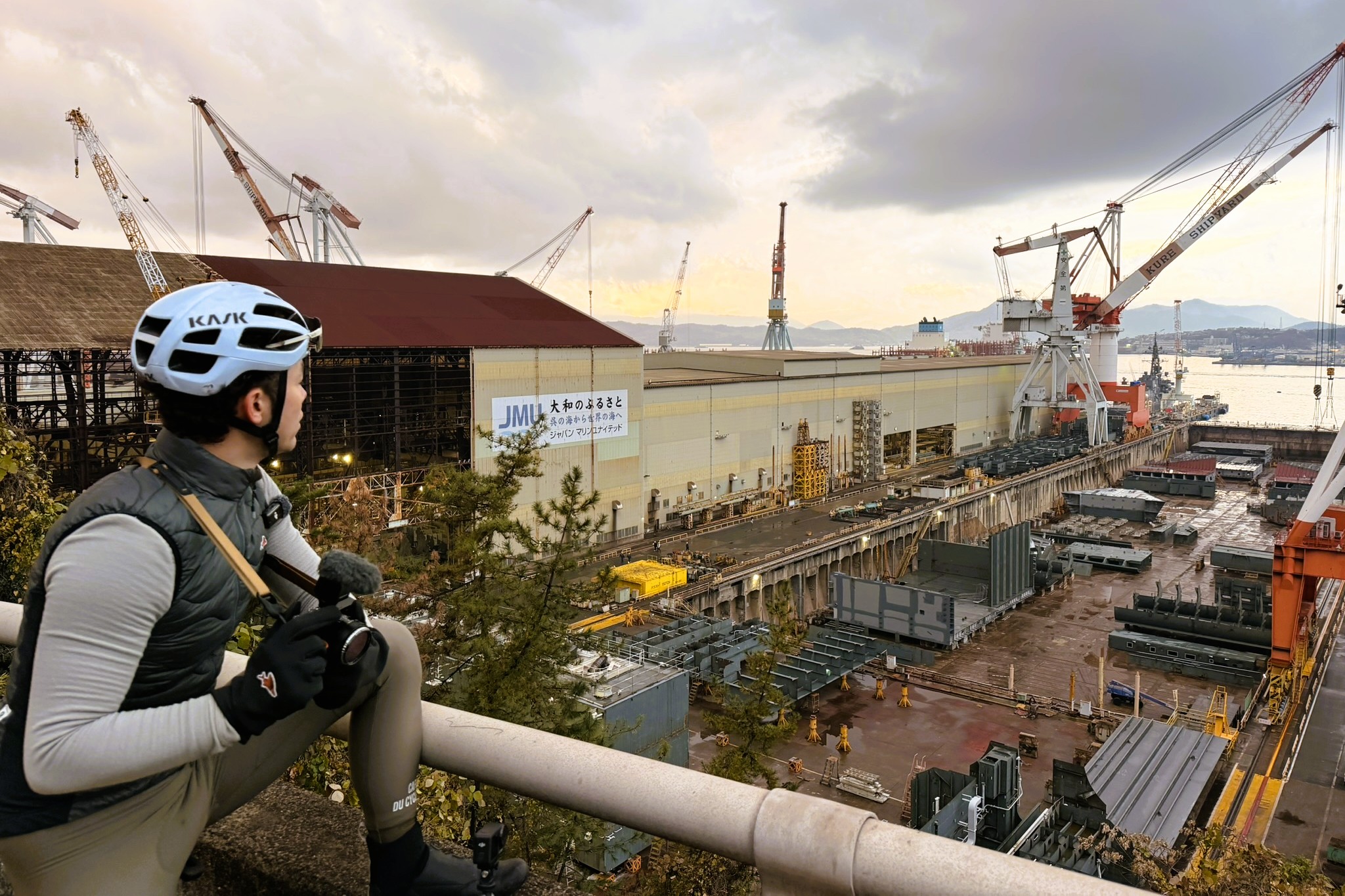 近くの道路からは、建造中の巨大な造船の姿を望むこともできる。距離はあるものの、そのスケールは圧倒的で、思わず遠近感が狂ってしまうほど。呉という街が持つ「ものづくり」の迫力を、走りながら肌で感じられる。