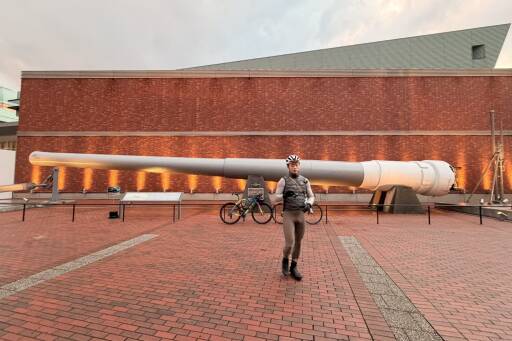 潜水艦の向かいにある 大和ミュージアム の敷地には、戦艦 陸奥 に搭載されていた41センチ主砲身が展示されている。建造当時は世界最大級の艦載砲だったというから驚きだ。目の前に立つと、そのスケール感に言葉を失う。理屈抜きで、とにかくでかい。