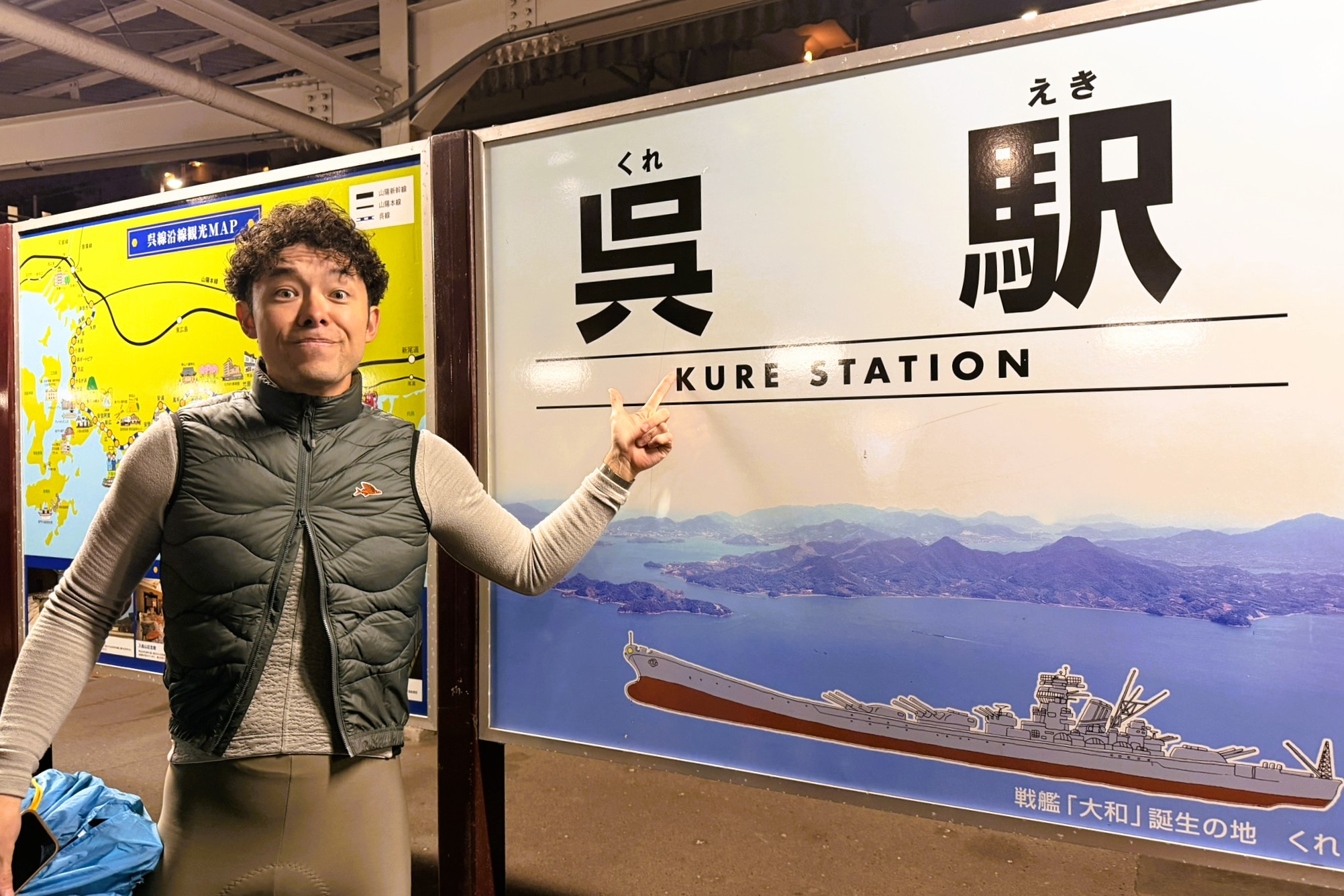 巨大建造物にテンションが上がりっぱなしのまま、ついにゴールの呉駅に到着。気づけばあたりはすっかり真っ暗だ。こうして無事に、かきしま海道サイクリングロードを走破。