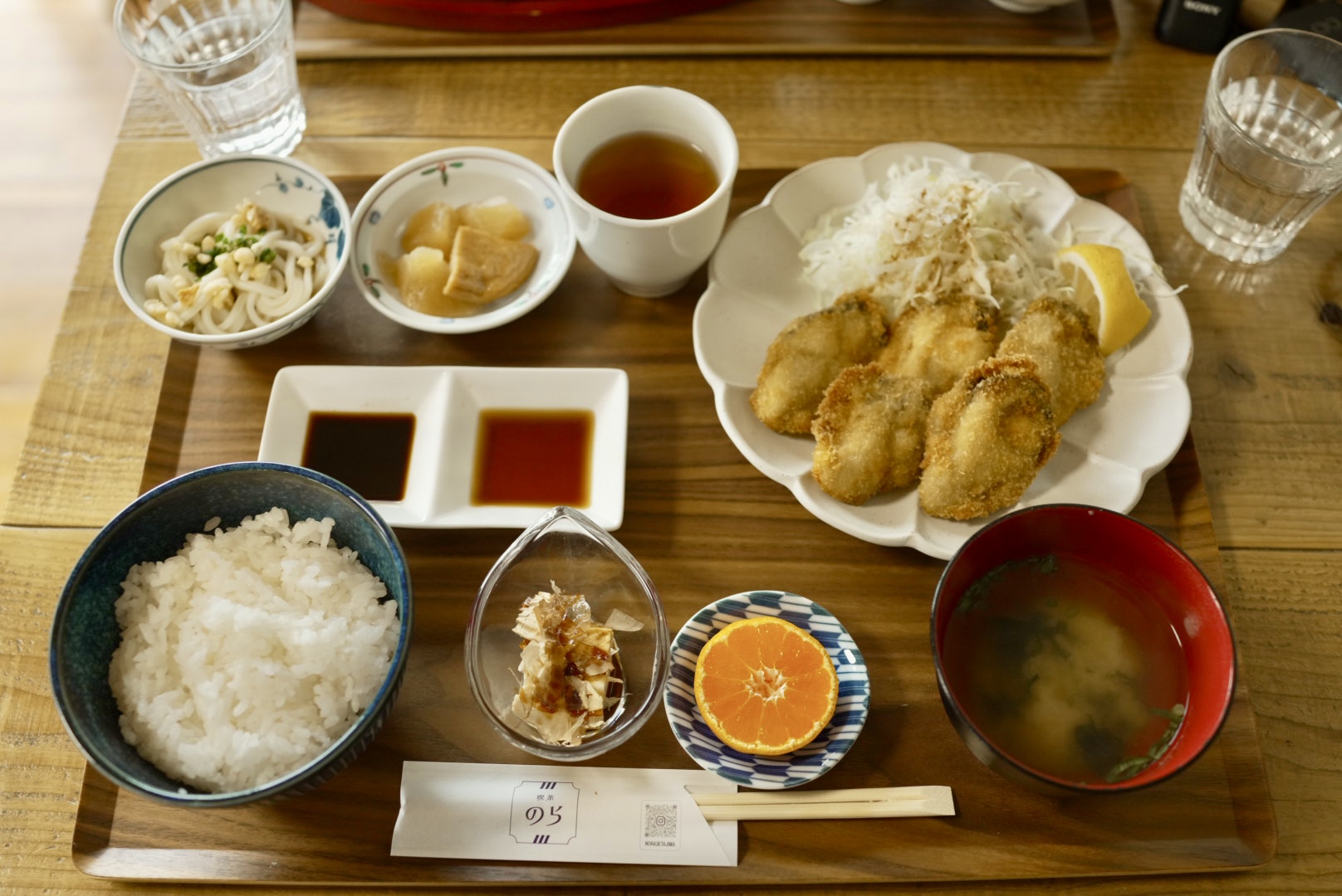 けんたさんは江田島名物の「カキフライ定食」(1,300円)を注文。主役の牡蠣はもちろん、付け合わせに至るまで地元食材をふんだんに使ったランチ。