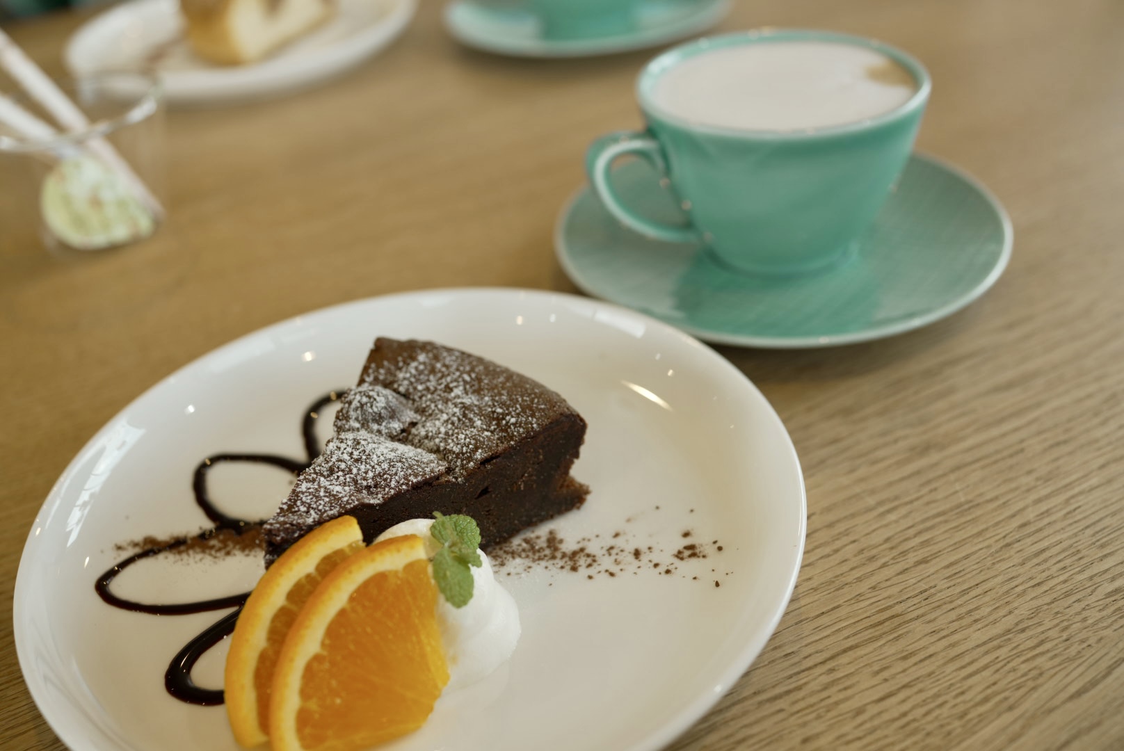 店内で焼き上げたガトーショコラとカフェラテを注文。添えられた江田島産のオレンジがほどよいアクセントになり、ここでも島の食材を大切にしていることが伝わってくる。走ったあとの身体に、ちょうどいい甘さだった。