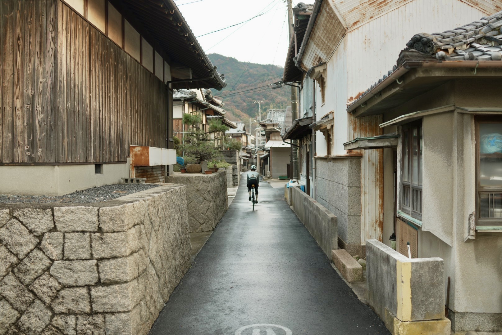 釣士田(りょうしだ)という港町を走っていると、思わず足を止めてしまう風情ある路地に出会った。石積みの塀と静かな家並み。通り過ぎるのが惜しくて、自然とカメラを向けていた。