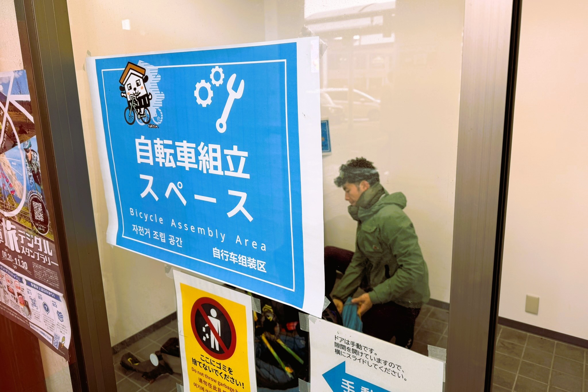2日目の朝は、宿泊先の「望湖楼」から自走で特急停車駅の倉吉駅へ。駅構内にある自転車組み立てスペースで輪行準備を行う。寒さをしのぎながら落ち着いて作業ができるのは、冬の旅にはとてもありがたい。
