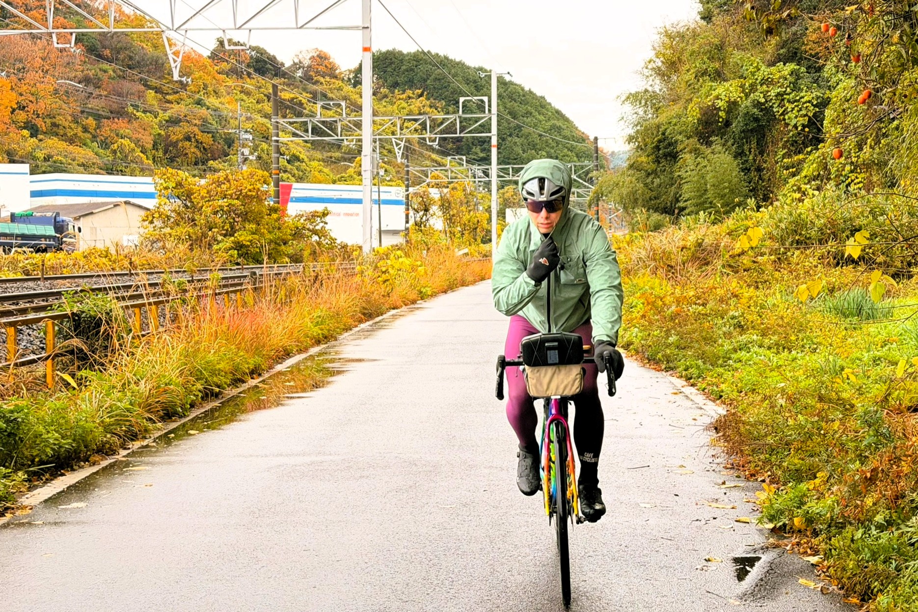暖房の効いた車内で揺られること約30分、米子駅に到着。駅前で自転車を組み立て、ライドの準備を整える。中海周遊サイクリングコースを基本に、中海を反時計回りで巡る約70kmの行程だ。小雨は残るものの、前日の強風は収まり、天気は回復に向かっていた。