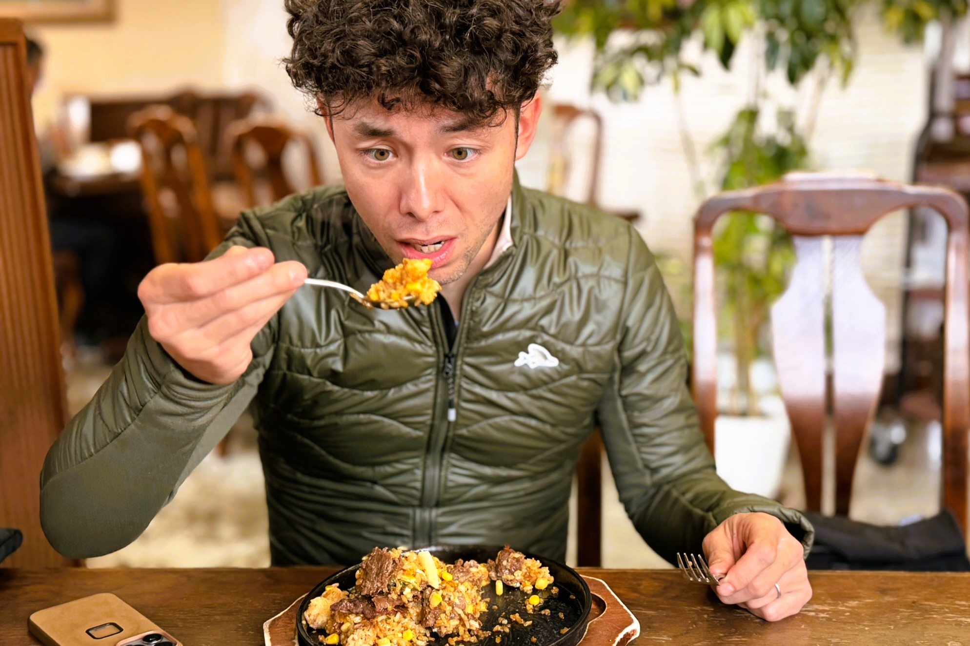 本日のおすすめメニュー「鉄板ライス」を注文。熱々の鉄板の上に、ライスとスライスされたビーフ、コーンがたっぷりとのり、香ばしい音と香りが食欲を一気に刺激する。