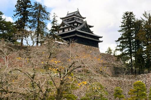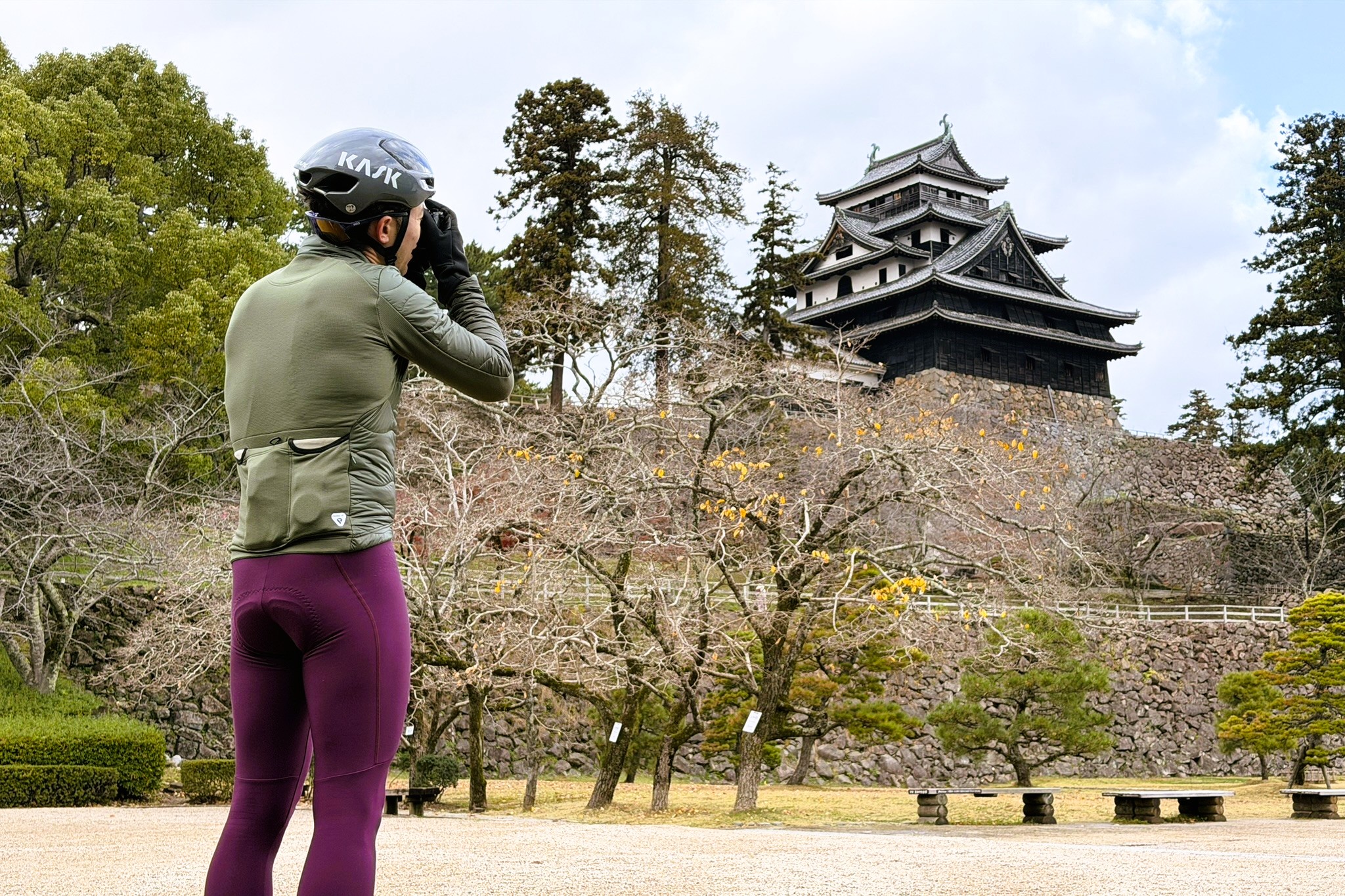 敷地内に無料の駐輪場があると知り、近くまで足を運んでみる。現存天守の迫力もさることながら、そびえ立つ石垣の高さに思わず息をのむ。これをすべて人の手で切り出し、積み上げたと想像すると、ただただ圧倒される。