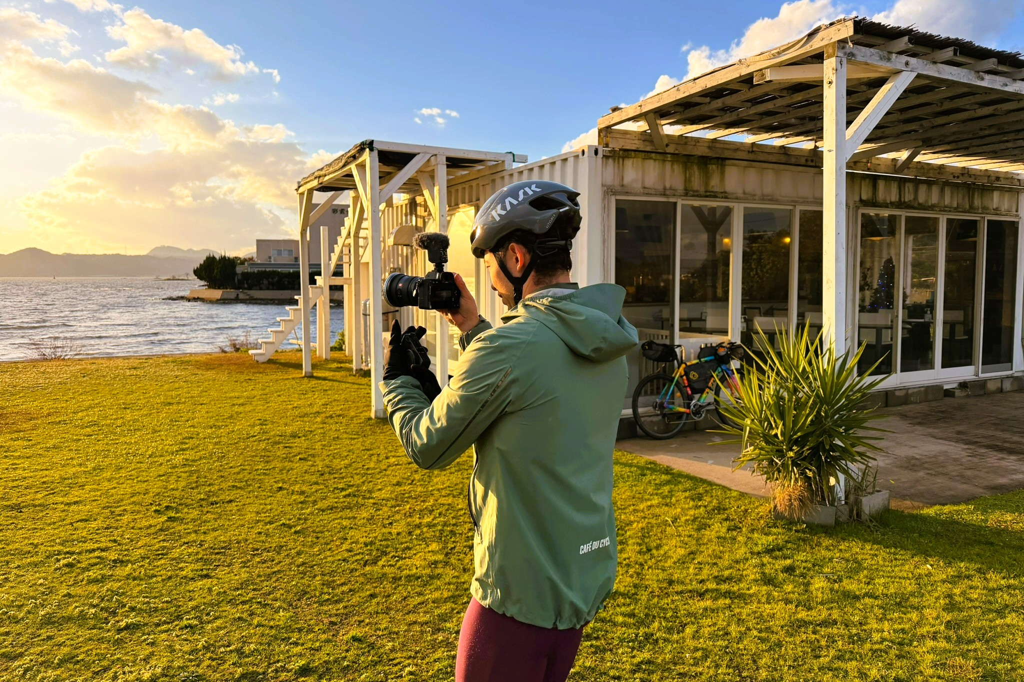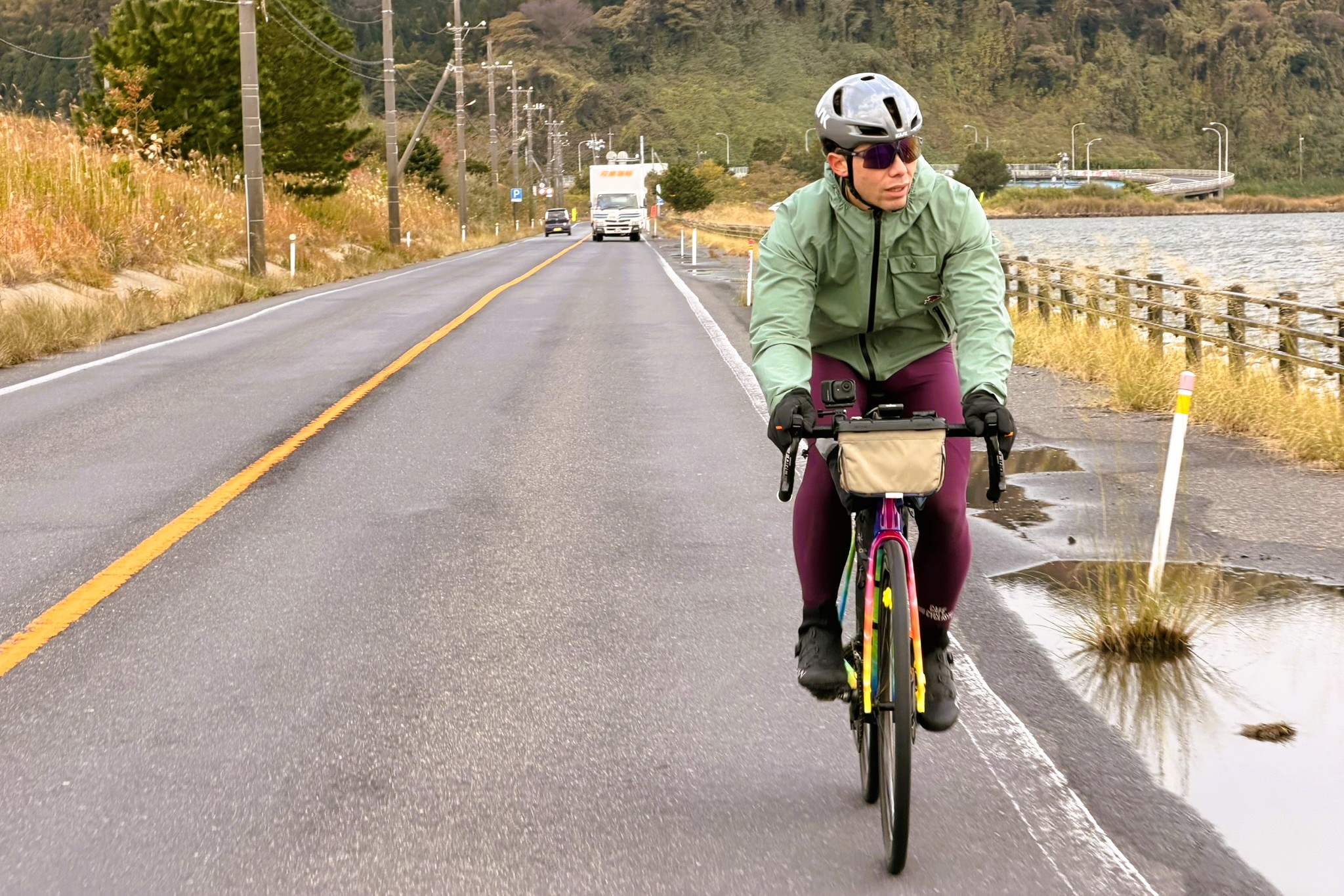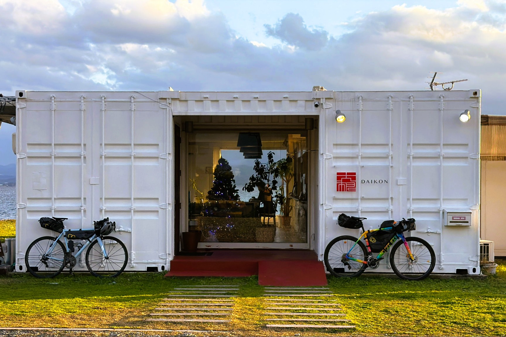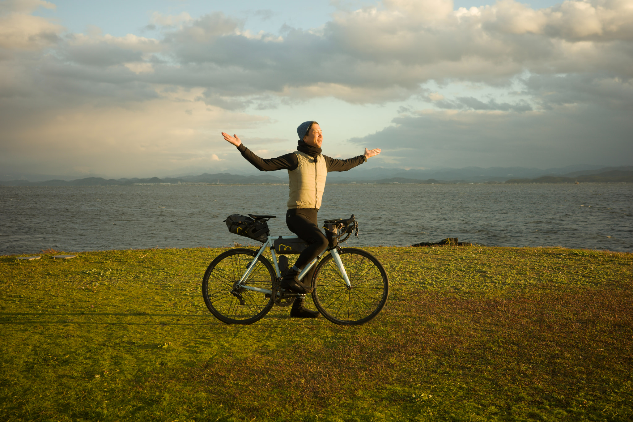 夕陽に染まる中海を前に、太陽のエネルギーを全身で浴びる。冷えた空気の中でも、光に包まれると不思議と心も体もじんわり温まっていく。こんな瞬間に出会えるからこそ、自転車旅はやっぱりおもしろいと、改めて実感した。