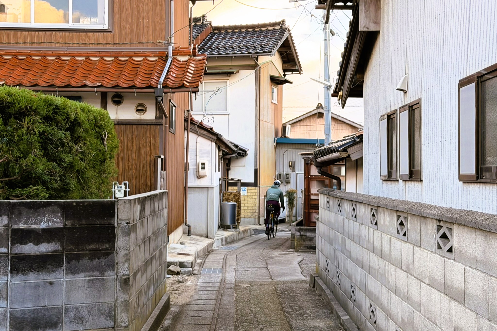 日本庭園で心をすっかり浄化したあとは、カフェ休憩を求めて島内の路地へ。ナビもあえて見ず、どこに続くかわからない細い道を進んでいく。この「たぶん合ってるはず…」という感覚こそ、自転車旅ならではのワクワクだ。