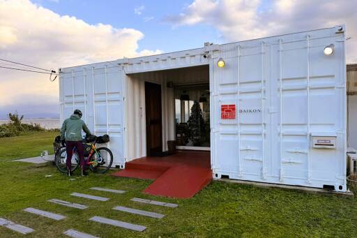 けんたさんが事前にリサーチして目をつけていたカフェ、その名も「DAIKON」。大根島の南側に位置し、コンテナハウスを改装したユニークな佇まいが目を引く。島の空気感にも不思議と馴染んでいて、「ここは間違いない!」と入る前から期待が高まる一軒だ。