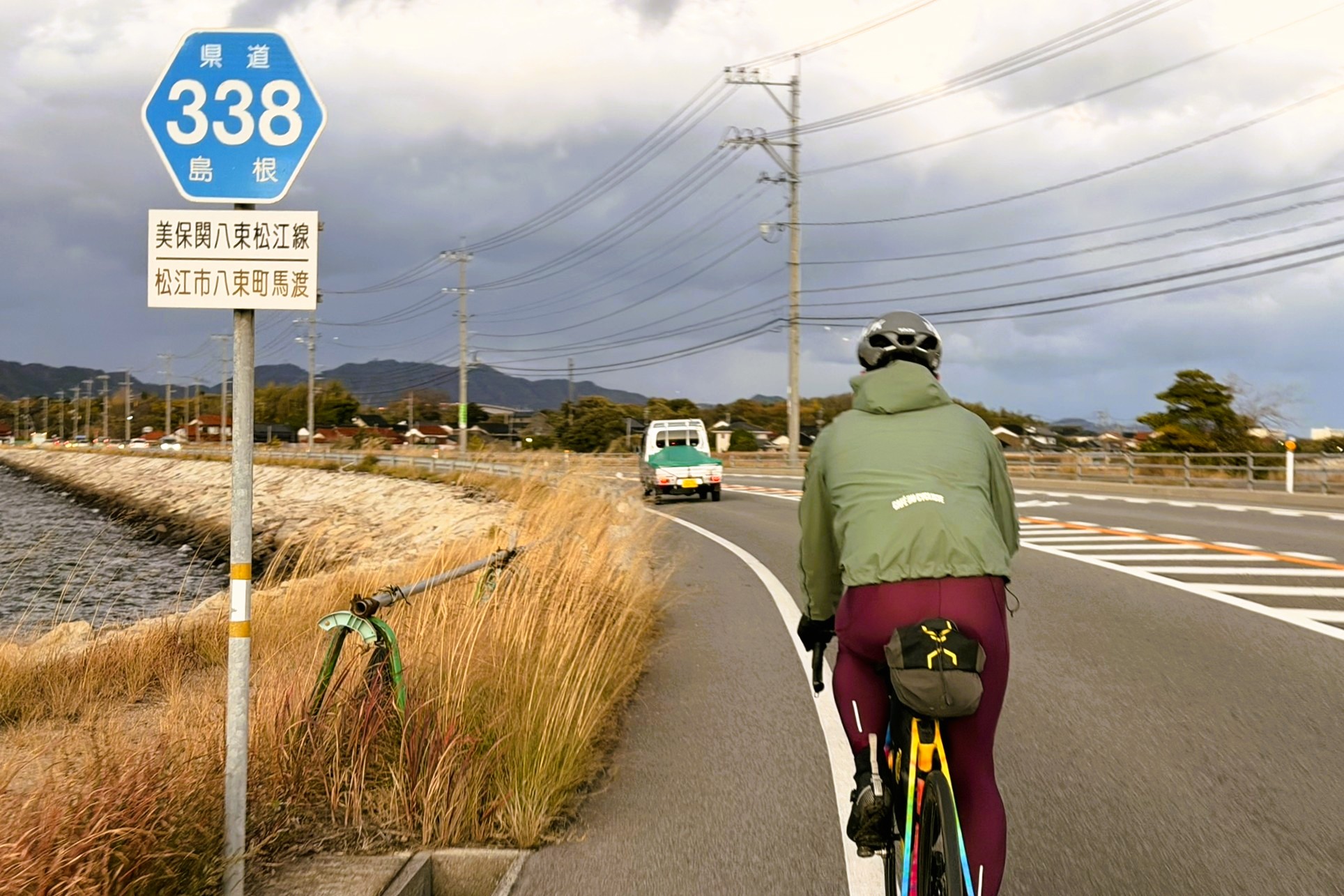 お腹を満たしたあとは、中海の南側をなぞるように松江市へ向かって走る。中海は鳥取県と島根県にまたがる汽水湖で、海と川が混ざり合う穏やかな水辺が特徴。広がる湖面を眺めながら、静かな景色の中を気持ちよくペダルを進めていく。