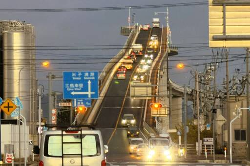 この旅、最後のスポットにふさわしい名物橋が江島大橋。大根島と空港側の半島を結び、遠くから見るととんでもない激坂に見えることから「ベタ踏み坂」の愛称で知られている。車のアクセルをベタ踏みしたくなる独特のシルエットは有名だが、自転車で向き合うと「本当に行くのか…?」と一瞬ためらってしまう迫力だ。