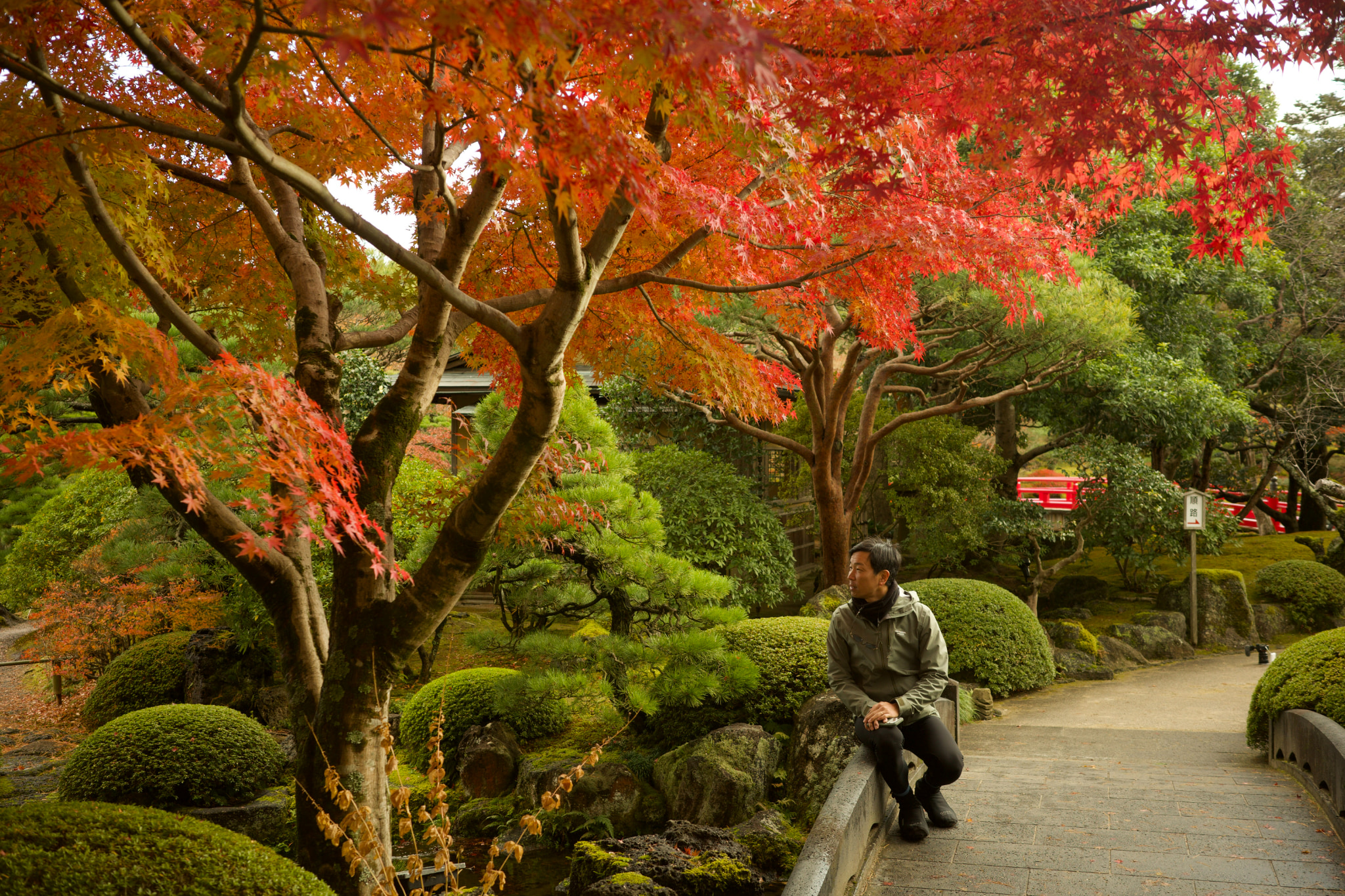 あまりの紅葉の美しさに、思わずけんたさんに「俺の写真を撮って!」とお願いしたくなるほど。カメラの腕も機材も申し分ないはずなのに、なぜかポーズは“おばさま風”に。それはさておき、自然とシャッターを切りたくなるほど、ここは本当に美しい場所だった。