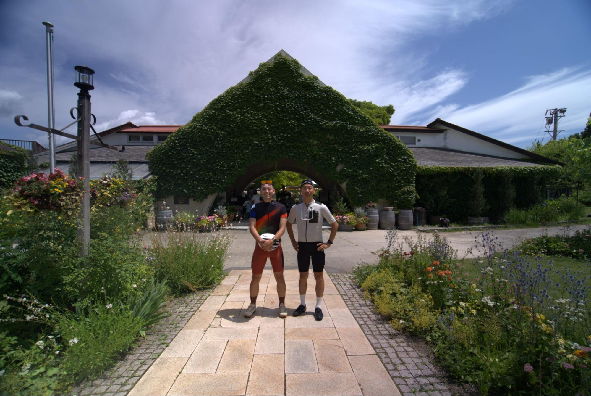 スタートから約20km地点にある「サンクゼールワイナリー本店」に立ち寄ることに。北信五岳道路の途中にあるワイナリー。建物の入口に続くお庭も手入れが行き届いており、素敵な空間となっている。