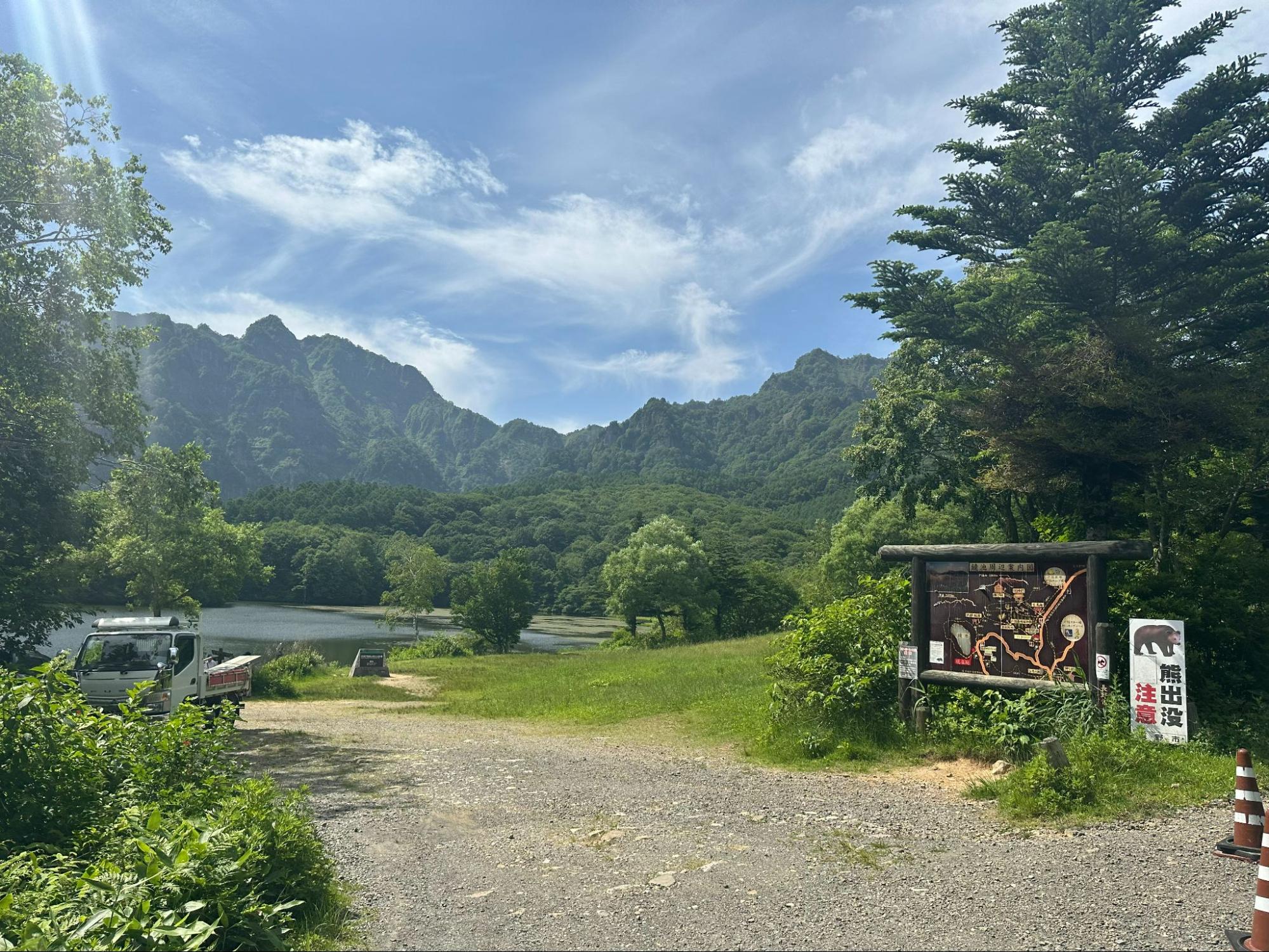 戸隠にあるおすすめスポット「鏡池」で休憩。名前の通り神秘的な戸隠連峰を鏡写しにしてくれる池。この日は風が吹いていたため、水面には山々の姿は映りはしなかったものの、正面に見える山々の迫力に圧倒された。