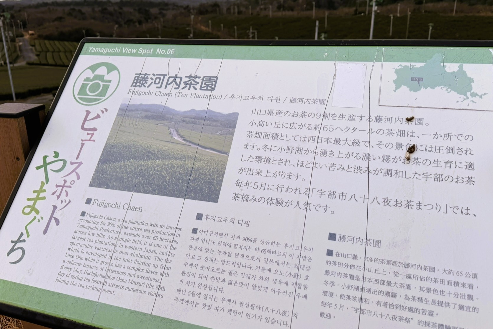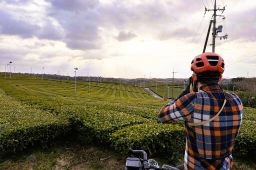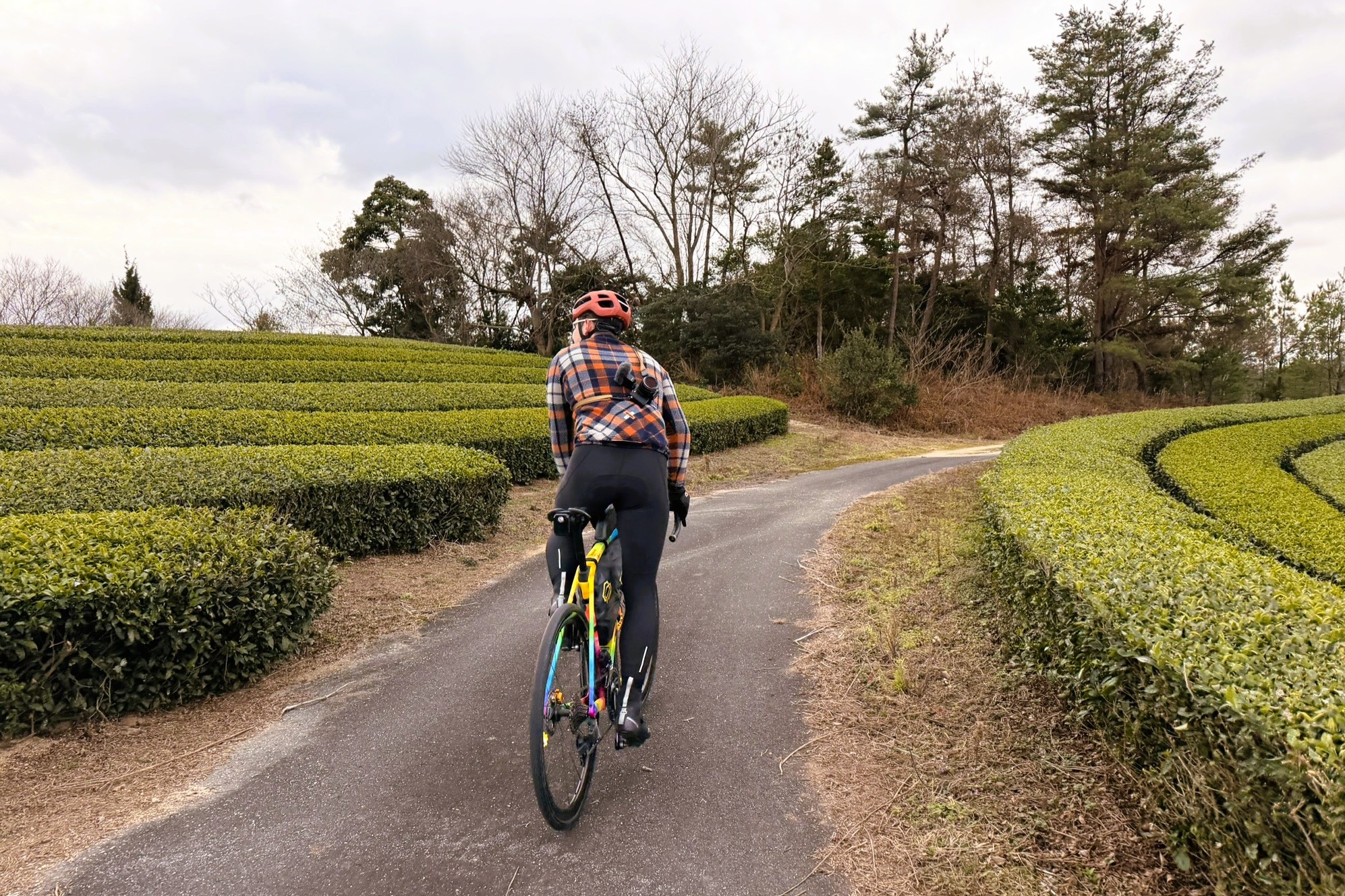 走り始めて10kmほど。まず最初に立ち寄ったのは、山口の自然とお茶文化に触れられる 藤河内茶園だ。入口が少し分かりにくく、迷いながら進んでいると、ふいに視界が開ける。目の前に広がったのは、一面に続くお茶畑。
