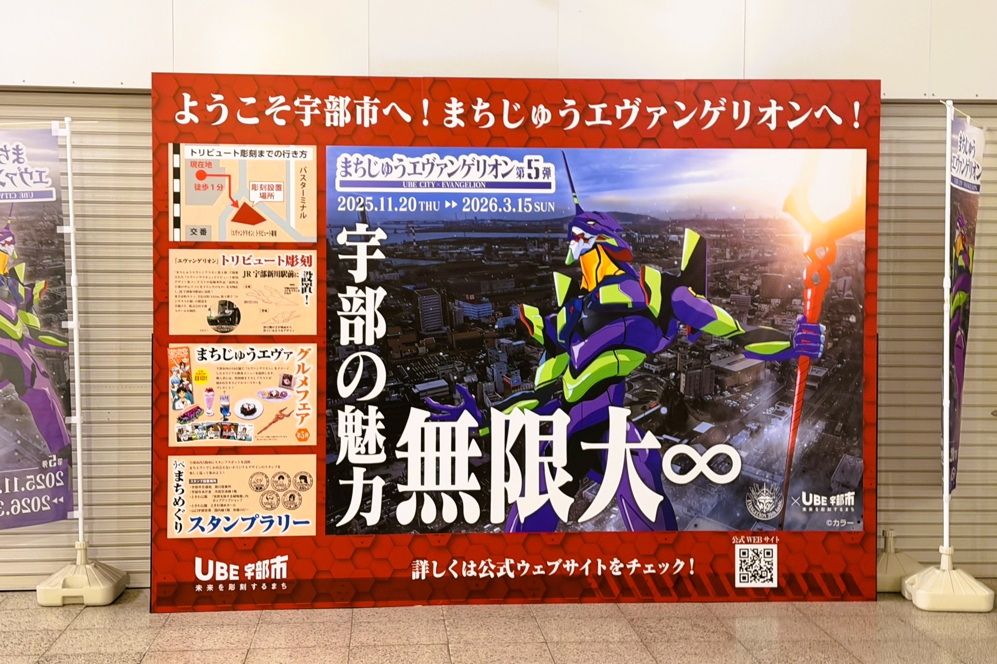 宇部市の中心となる宇部新川駅に到着。実は宇部市は、アニメ「エヴァンゲリオン」の監督を務めた庵野秀明の出身地として知られている。