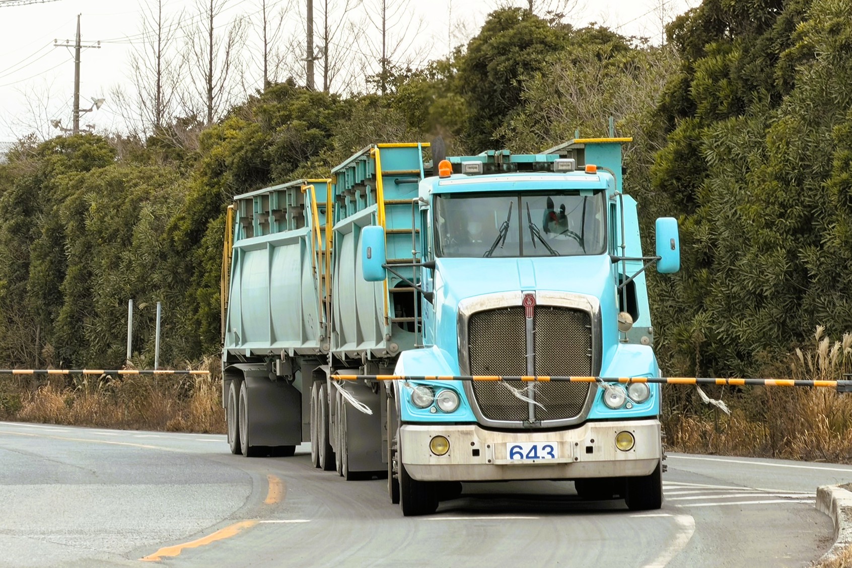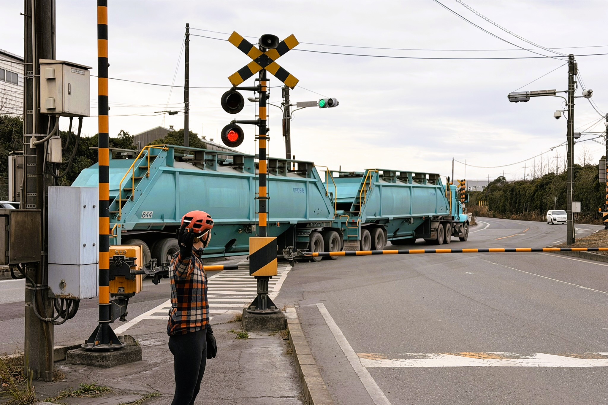 しばらく走ると、見慣れた踏切が現れた。しかし、そこに線路は見当たらず、あるのは道路だけ。遮断器が下りたあとに通過したのは電車……ではなく、超大型のトラックだった。