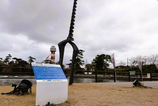 全長は約7メートルもあり、池の脇に突き立つその姿は強烈な存在感を放っている。ロンギヌスの槍は、新世紀エヴァンゲリオンの作中で、特別な武器として登場する重要なアイテム。鋳鉄製のこの槍は、地元企業の宇部スチールが製造。製造過程の映像を見てから現地で実物を目にすると、その迫力と重みがよりリアルに伝わってくる。(宇部スチールのYouTube動画)