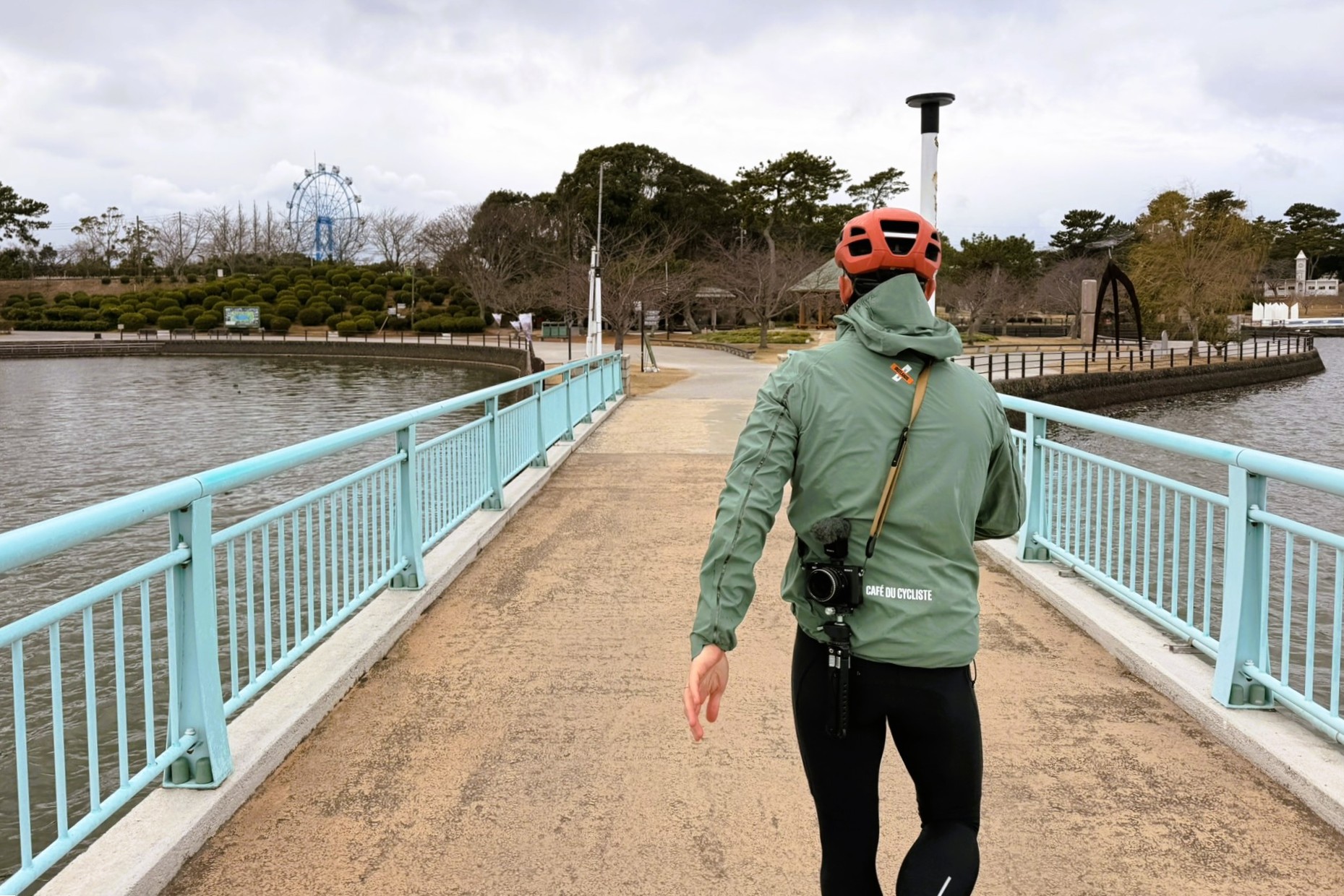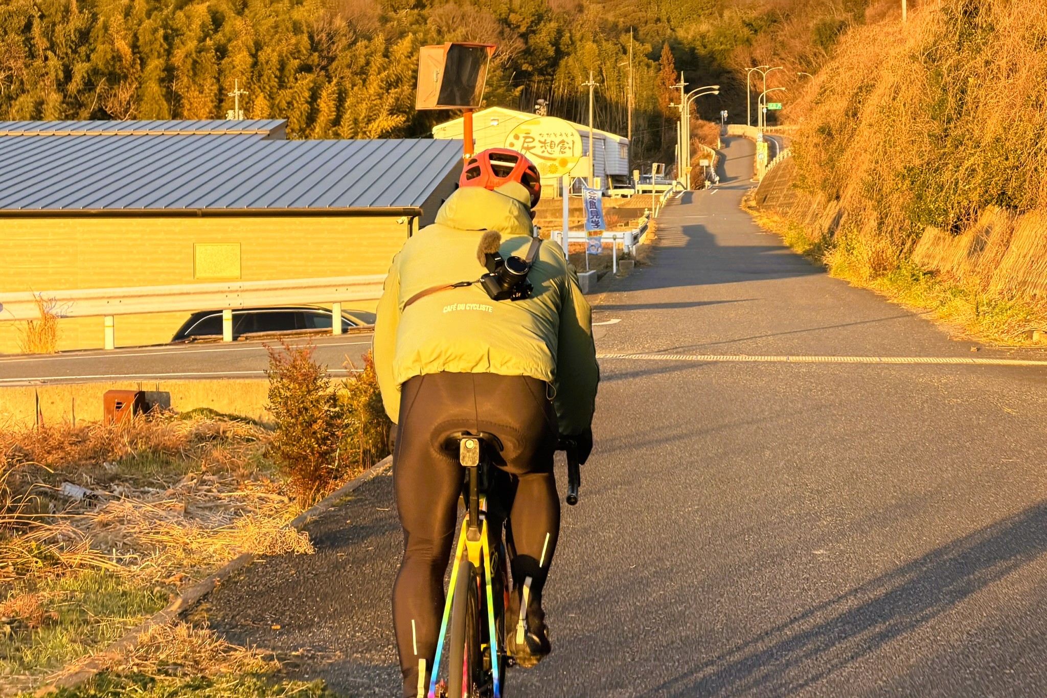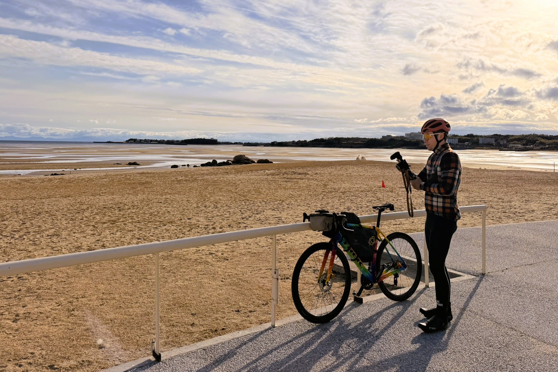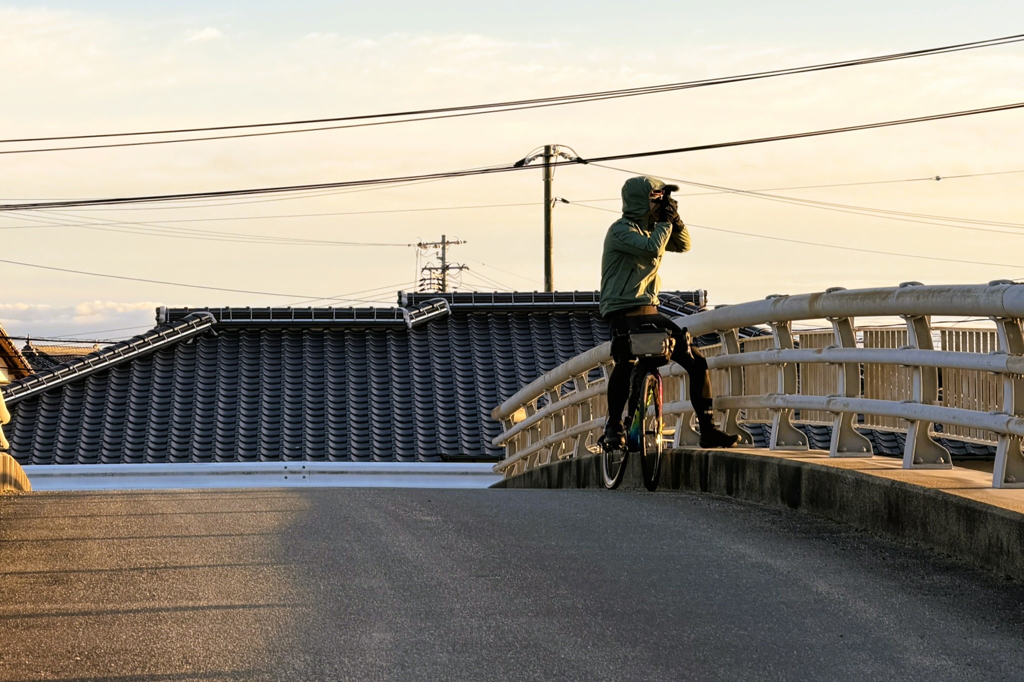 道の駅を後にして走り出すと、あまりにも夕日がきれいで、思わず橋の上で足を止めた。一見するとエヴァンゲリオン推しのルートにも見えるが、実際に走ってみると、海や空、街の表情までしっかり楽しめるバランスの取れたコースだと気づく。こんなふうに、ふとした瞬間に立ち止まれるのも、自転車旅ならではの良さだ。