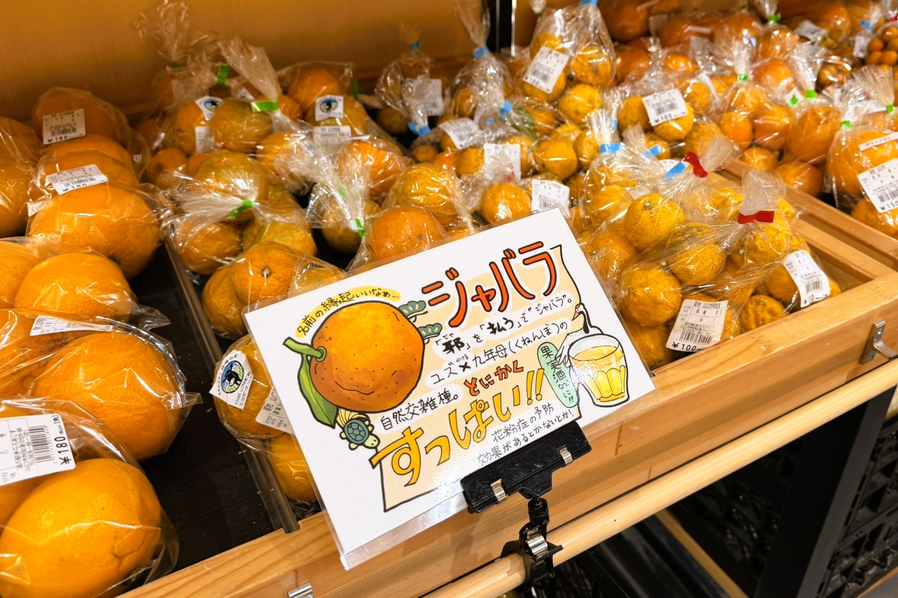 店内には、珍しい名前の柑橘「ジャバラ」も並んでいた。強い酸味とほのかな苦みが特徴で、果汁や皮に含まれる成分が注目されている柑橘だ。かなりすっぱいが、花粉症対策になると言われているのは正直かなり魅力的。