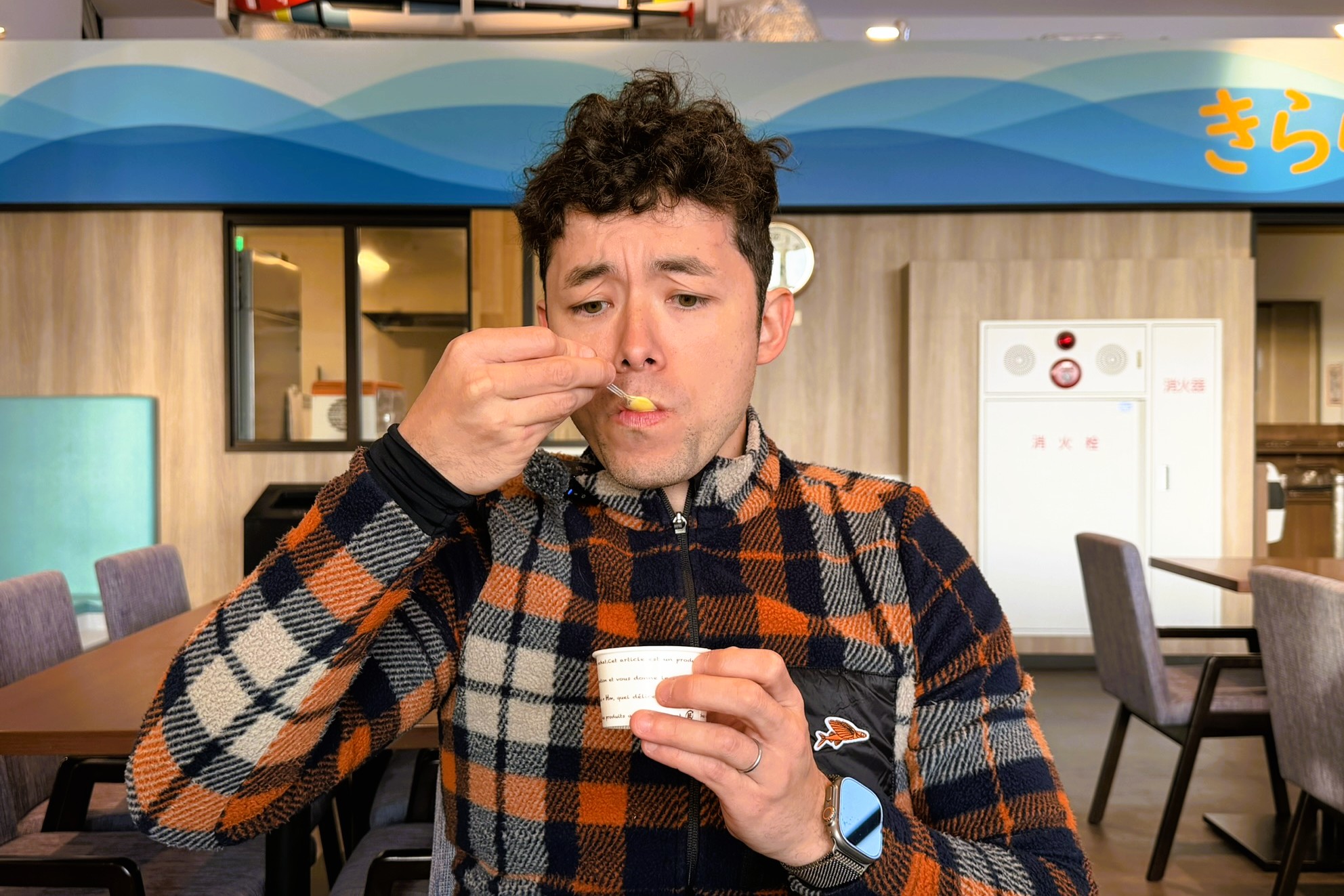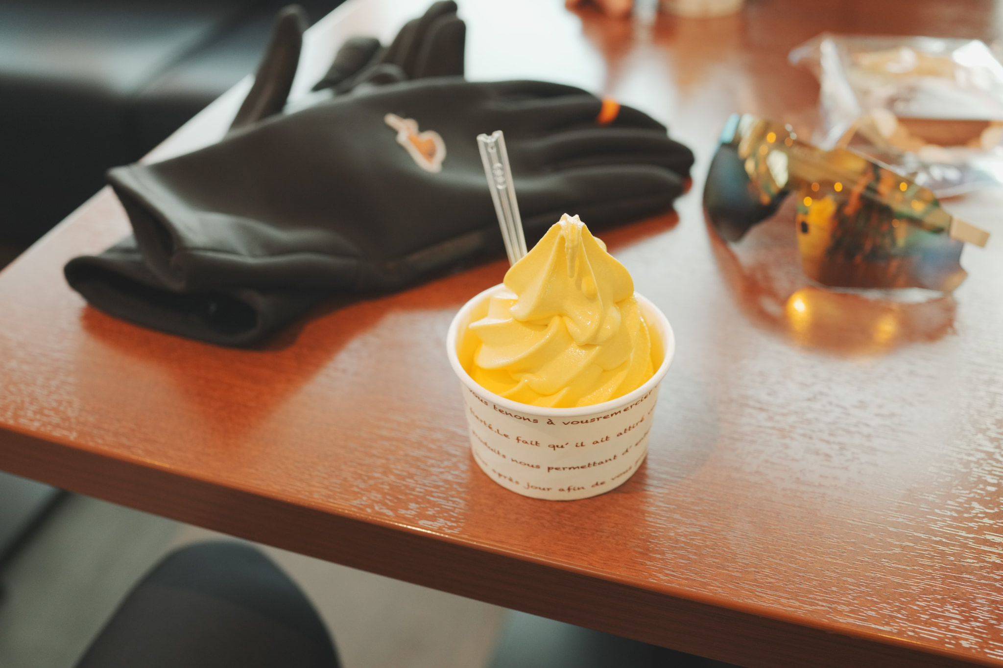 店内の軽食コーナーで、阿知須特産のかぼちゃ「くりまさる」を使ったソフトクリームをいただく。